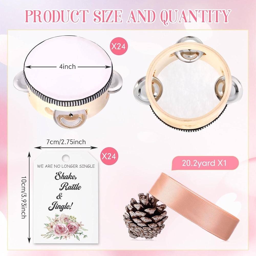 24 Set 4 Inch Tambourine for Adults Tambourines Bulk Wooden Hand Held Drum with Metal Jingles, Gift Tags, Beige Ribbon Percussion Gift Musical Instrument for Church Wedding Party Favor
