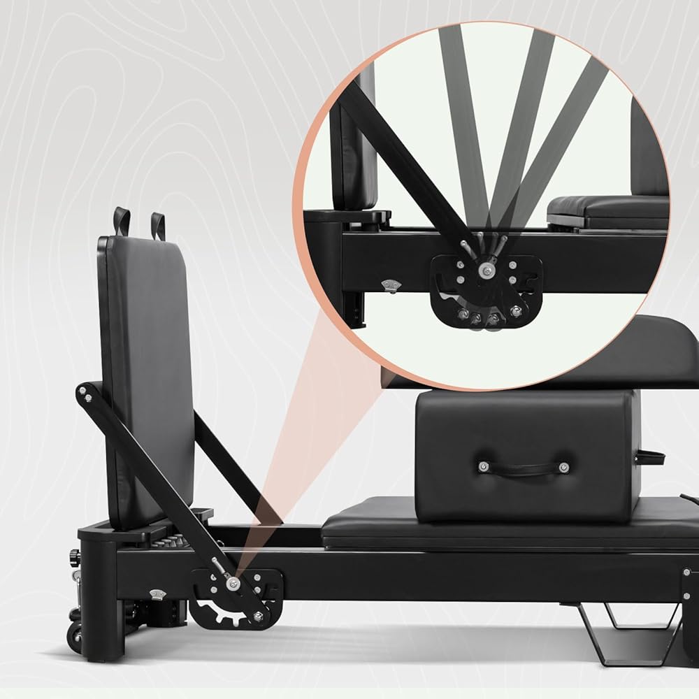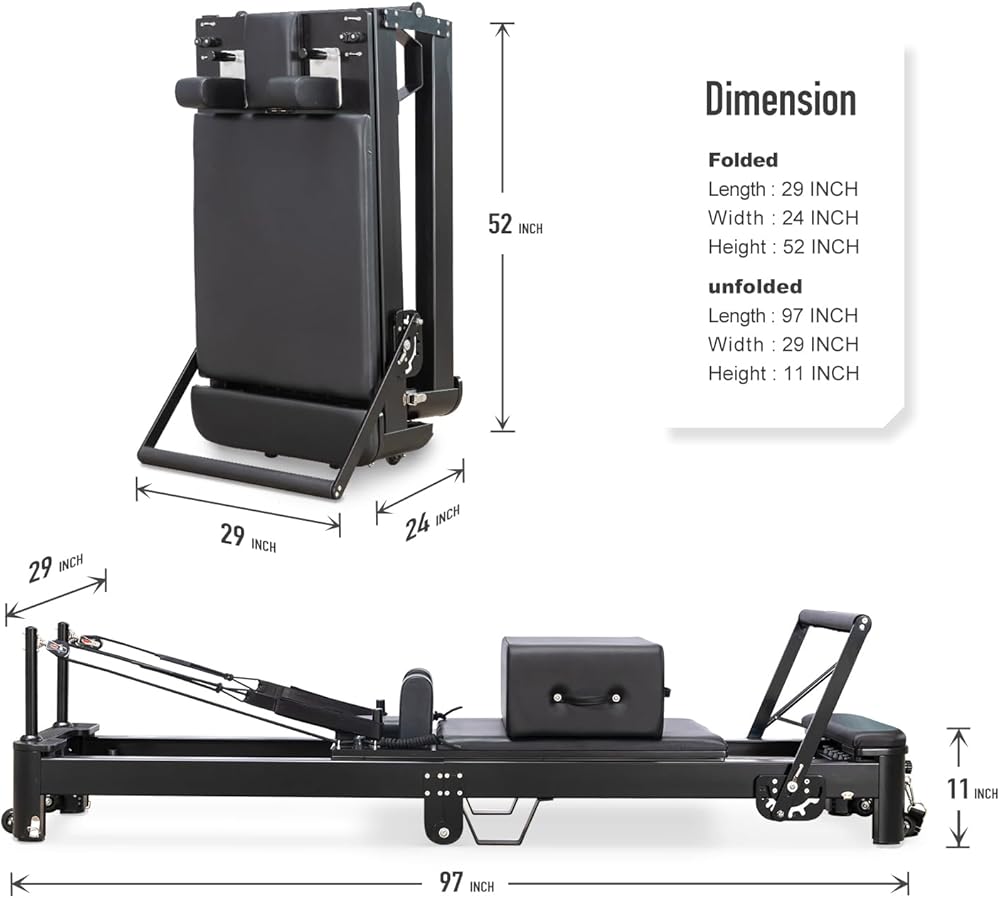FOLDABLE PILATES TRAINER FEATURES - The main body frame is made of aluminum and the parts are made of stainless steel and partly wood. The folding part is held in place by height-adjustable metal legs, and the trainer is also equipped with two quick-adjustment systems on the footrests and spring bars for a comfortable, uninhibited workout. The baby stroller system is equipped with 8 polyurethane wheels for close parallel movement and smooth, quiet movement.