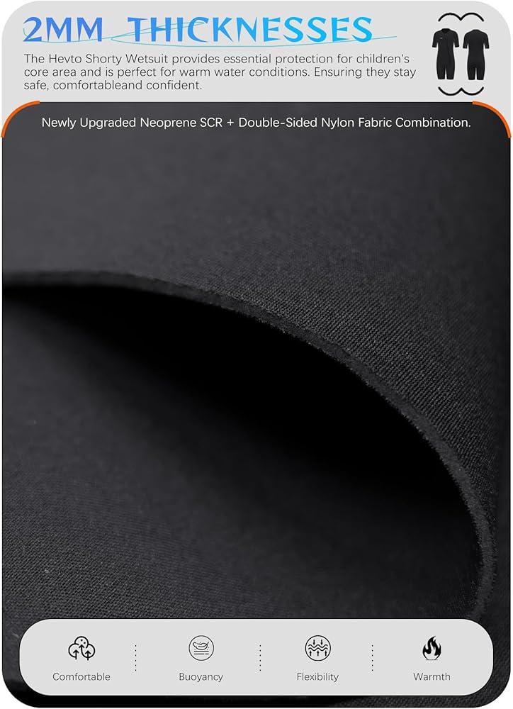 Warmth & Flexibility: Hevto kids shorty wetsuit is made from Neoprene SCR and double-sided nylon fabric, offering a 2mm thickness throughout the entire suit. This design ensures warmth and flexibility, keeping your child comfortable during swimming lessons, beach play, and other water activities.