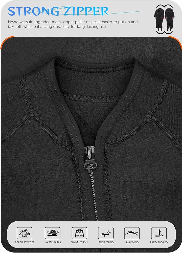 Sturdy Zipper: Designed for convenience, the Hevto kids shorty wetsuit features a front zipper for easy on and off, allowing your child to dress independently. The strong metal zipper head ensures a secure fit, and the durable stitching guarantees long-lasting use.