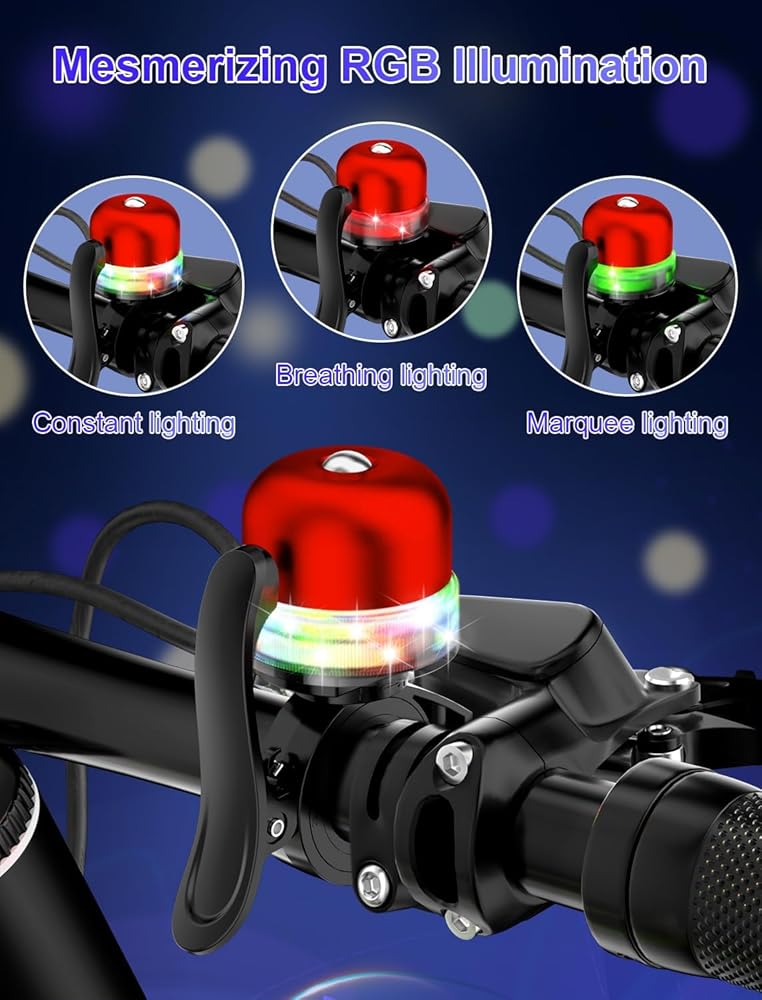 【Mesmerizing RGB Illumination】This bicycle bell for kids have 3 Rgb lighting modes: constant lighting, breathing lighting and marquee lighting. (Breathe and marquee lights flash for 5s on bell tap.)