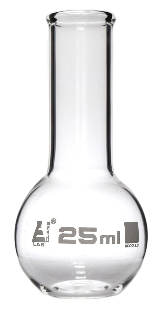 25ml capacity Florence boiling flask made out of high quality, heavy duty borosilicate glass. Narrow neck, beaded rim and flat bottom. No stopper included. Flask measures 3.25" tall.