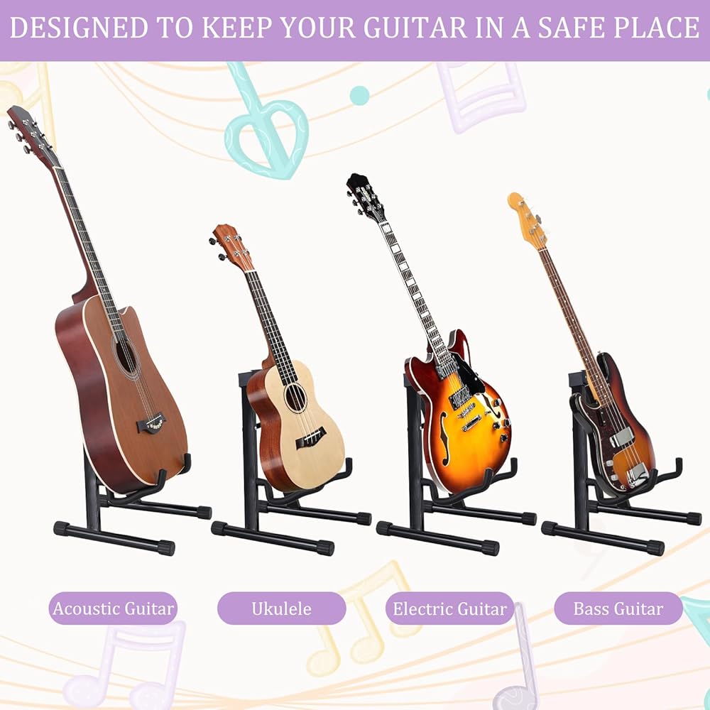 Universal Fit: Adjustable stand arms fit a variety of guitar shapes, including acoustic guitars, electric guitars, bass guitars, and more.