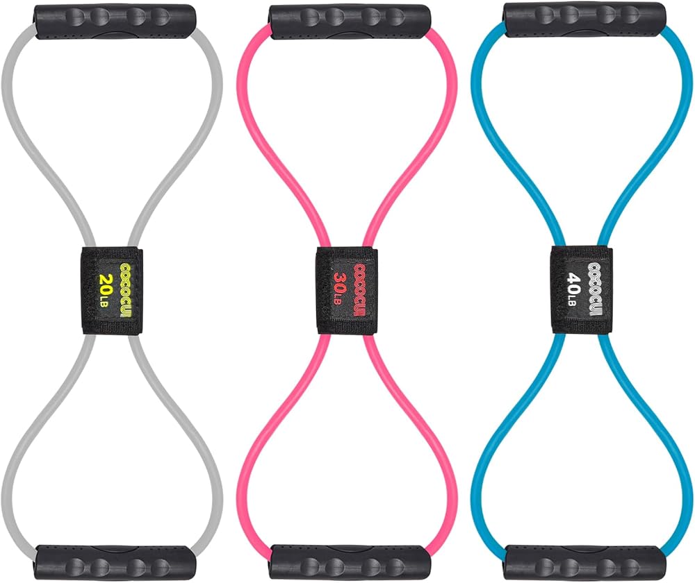 COCOCUI Figure 8 Fitness Resistance Bands with Handles are a set of 3 exercise tube bands made from high-quality natural latex, available in yellow (20 lbs), red (30 lbs), and black (40 lbs). Designed in a figure-8 shape, they offer effective strength training for arms, back, shoulders, legs, and hips, suitable for physiotherapy, exercise and fitness, yoga, body building, and strength training. The bands feature soft rubber grips for comfort and secure hold, and come with a premium carry bag and workout guide, making them portable for use at home, gym, or office. They are safe, durable, flexible, and tough, ideal for body stretching, resistance training, and aiding in recovery from injuries like torn ligaments, knee issues, etc., and are suitable for men, women, children, and the elderly. resistance bands, exercise bands, workout bands, back workout equipment, back exercise equipment, upper back stretcher, back stretcher, back exercise, back workout, arm bands, arm exerciser, arm band, arm exercise equipment, arm workout equipment, arm bands for workout arm workout, resistance bands for arms, arm workout equipment for women, arm resistance bands for women, weighted arm bands, arm exercise bands, arm stretch bands, arm resistance bands, arm exercise chest workout equipment, chest exercise equipment, resistance bands for legs, leg bands resistance, leg workout equipment, rubber bands for exercise, rubber exercise bands, rubber band for exercise, exercise rubber bands