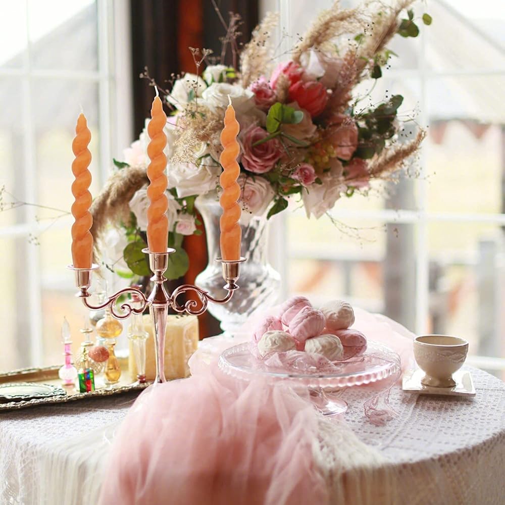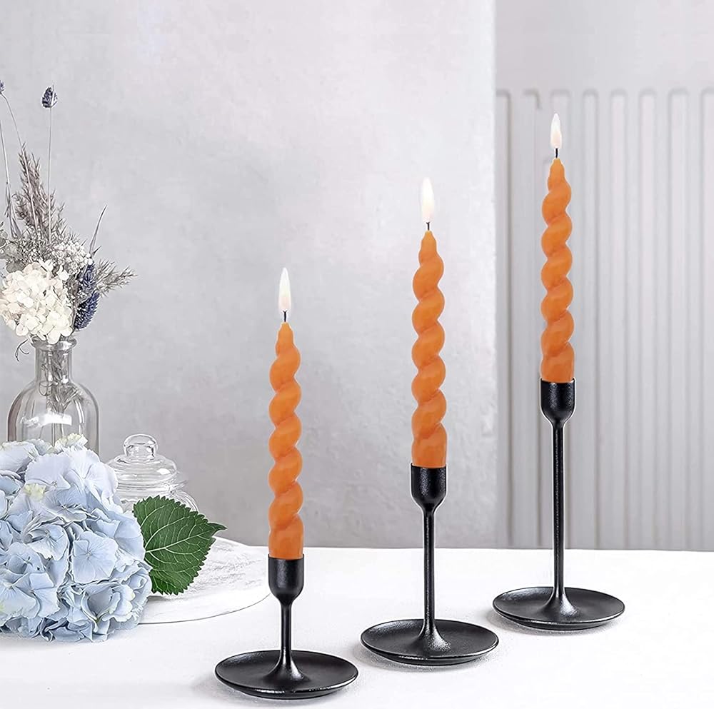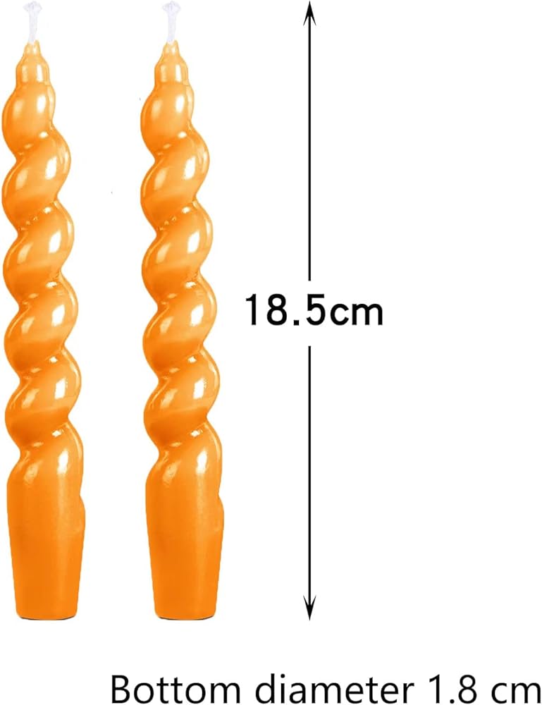 🕯【Spiral Taper Candles】: 2pcs Orange candles feature a spiral taper design .Wick: smoke-free, 100% pure cotton lead-free wick. Clean, Unscented, Burning Wax,Trim wick after each use.