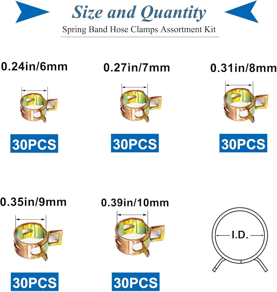 150Pcs Spring Band Hose Clamps Assortment Kit,5 Sizes Fuel Line Hose Clamps,Low Pressure Air Clip Strap Clamp for Silicone Vacuum Hose Clamp Fuel Line Clamps (6mm 7mm 8mm 9mm 10mm)