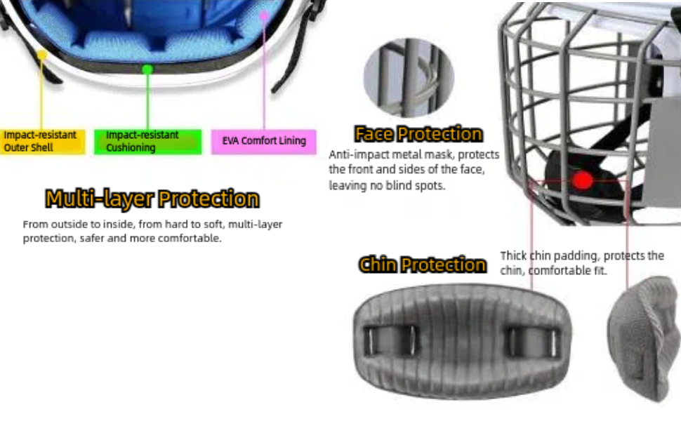- 【Impact Helmet】: This Ice Hockey Helmet features a high density foam layer that reduces impact and protects effectively