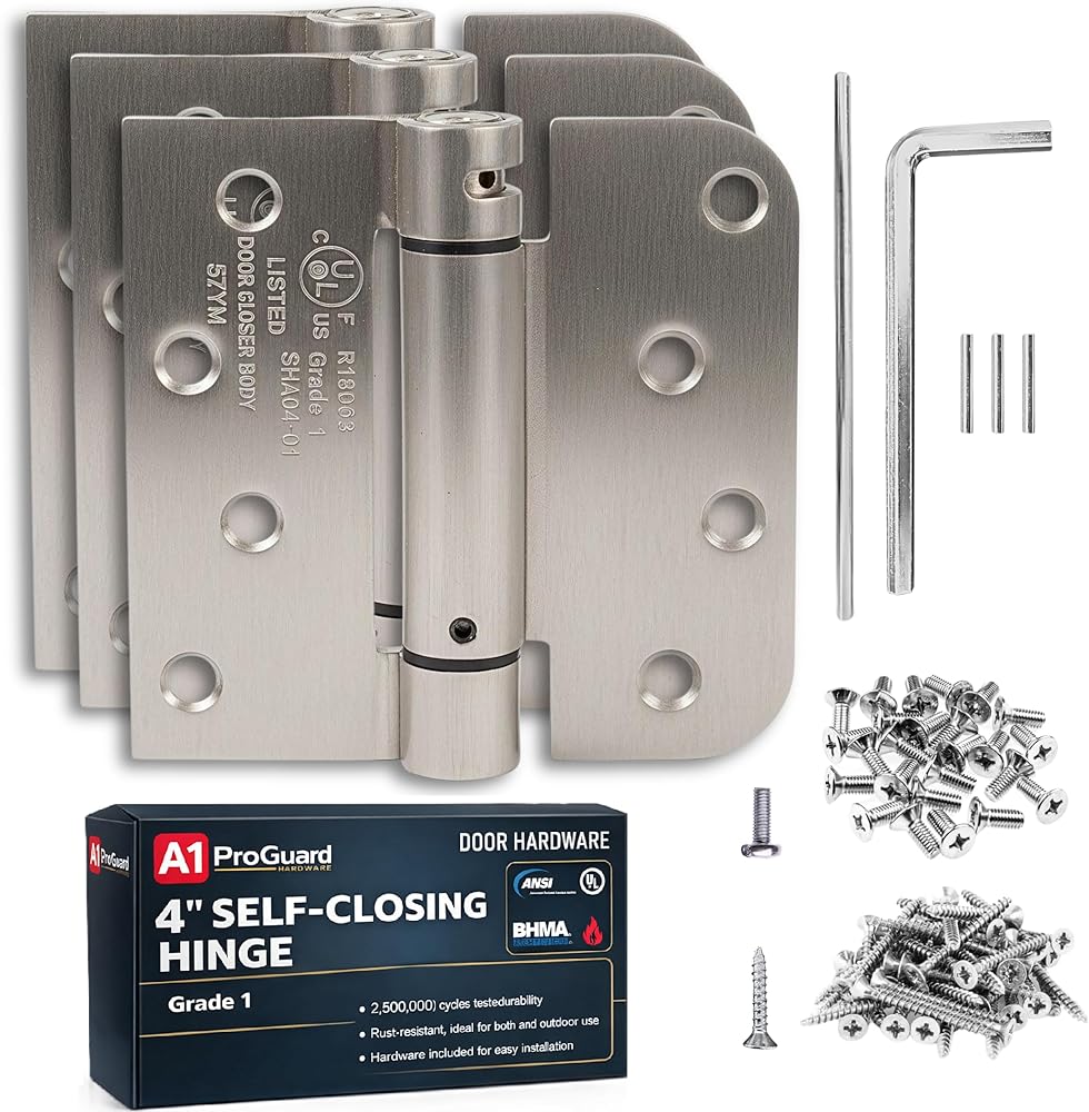 SIZE: Spring hinge is 4" X 4" with 5/8-inch radius and square corner. These are UL listed, which means these meet the safety standards for spring-loaded door hinges in the United States and Canada