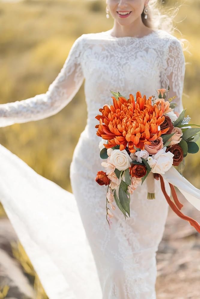 Briful 6 Pcs Burnt Orange Artificial Mums for Outdoors Fall – 25.6’’ Long Stem Faux Chrysanthemums, Large 6’’ Silk Fall Flowers for Wedding Bouquets, Centerpieces, Porch Décor, Indoor Home Decoration