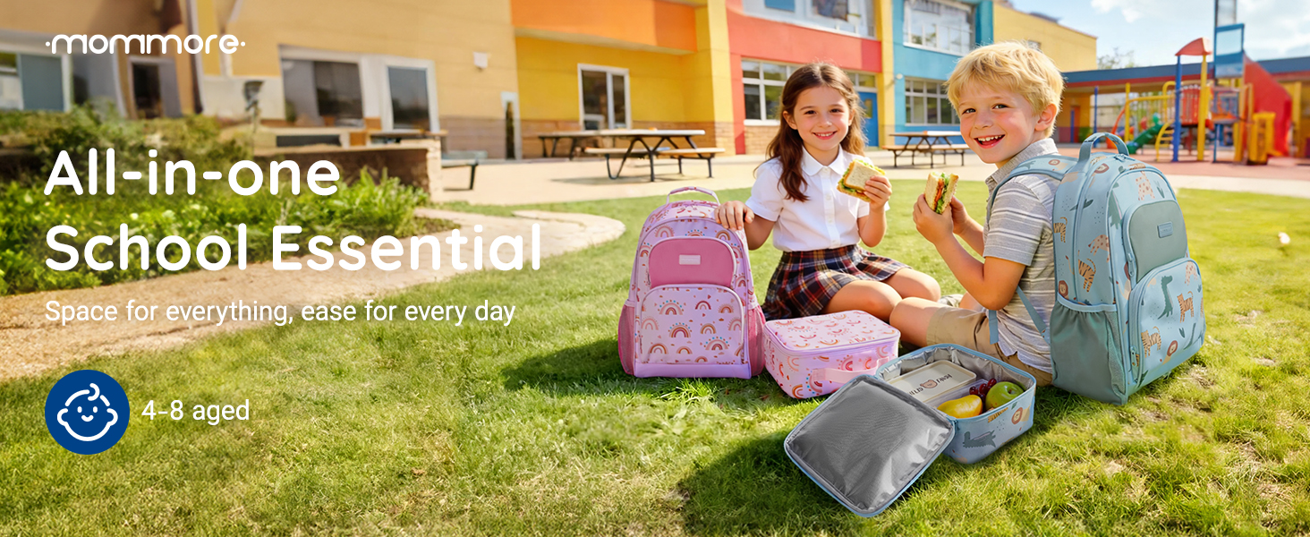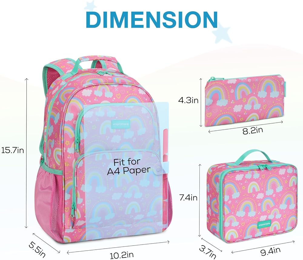 3-in-1 Kids Backpack Set: The bookbag's size is 10.2 x 5.5 x 15.7 inch( fit A4 folder). The size of the insulated lunch bag is 7.4 x 3.7 x 9.4 inch. The size of the pencil case is 8.2 x 4.3 inch. Recommended for children from 3 to 13 years old