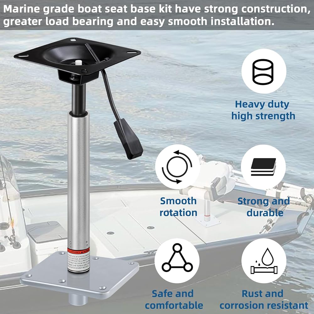 Sturdy & Solid boat seat mount kit: The aluminum boat seat extension post with a steel pin + aluminum boat seat base for corrosion resistant in various harsh marine conditions + steel integral power pedestal mount with nitrided coating for rust prevention, strong body to provide a great load bearing and good pressure to raise seat.