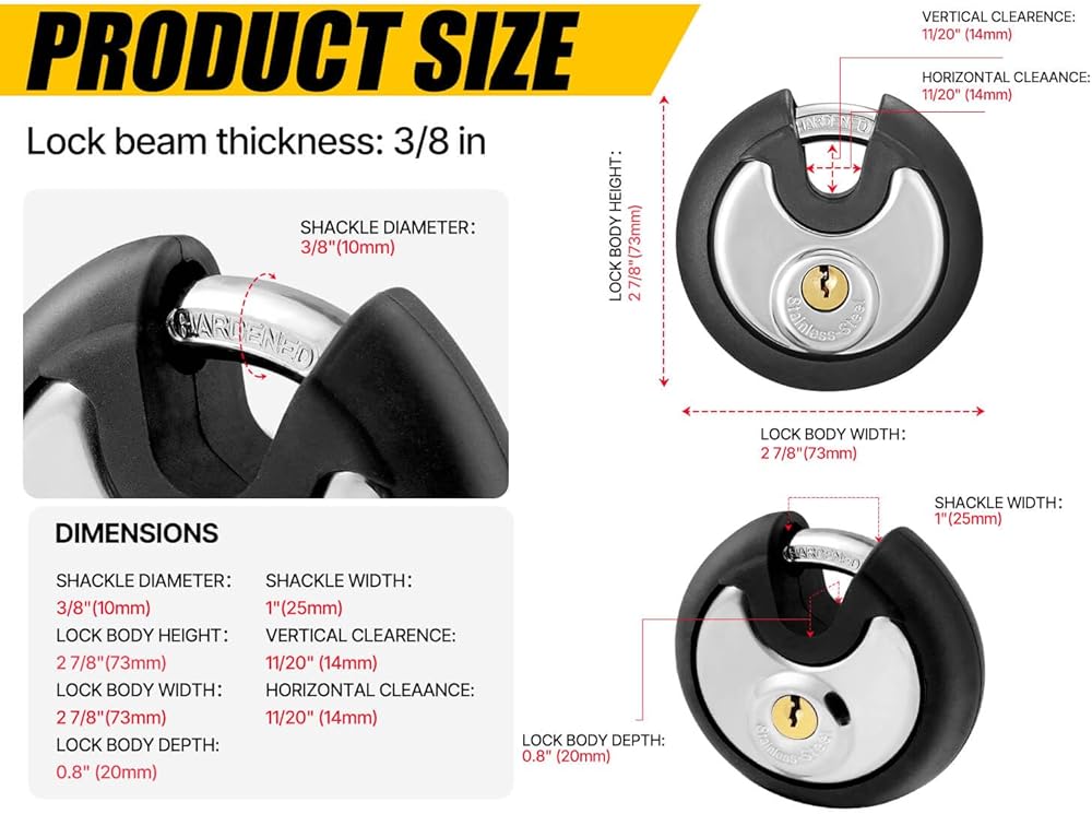 Widely Used - The disc lock is suitable for both indoor and outdoor use, making it ideal for storage units, lockers, garages, sheds, outdoor gates, warehouses, doors, Pods, trailers, and mobile trucks, among others.