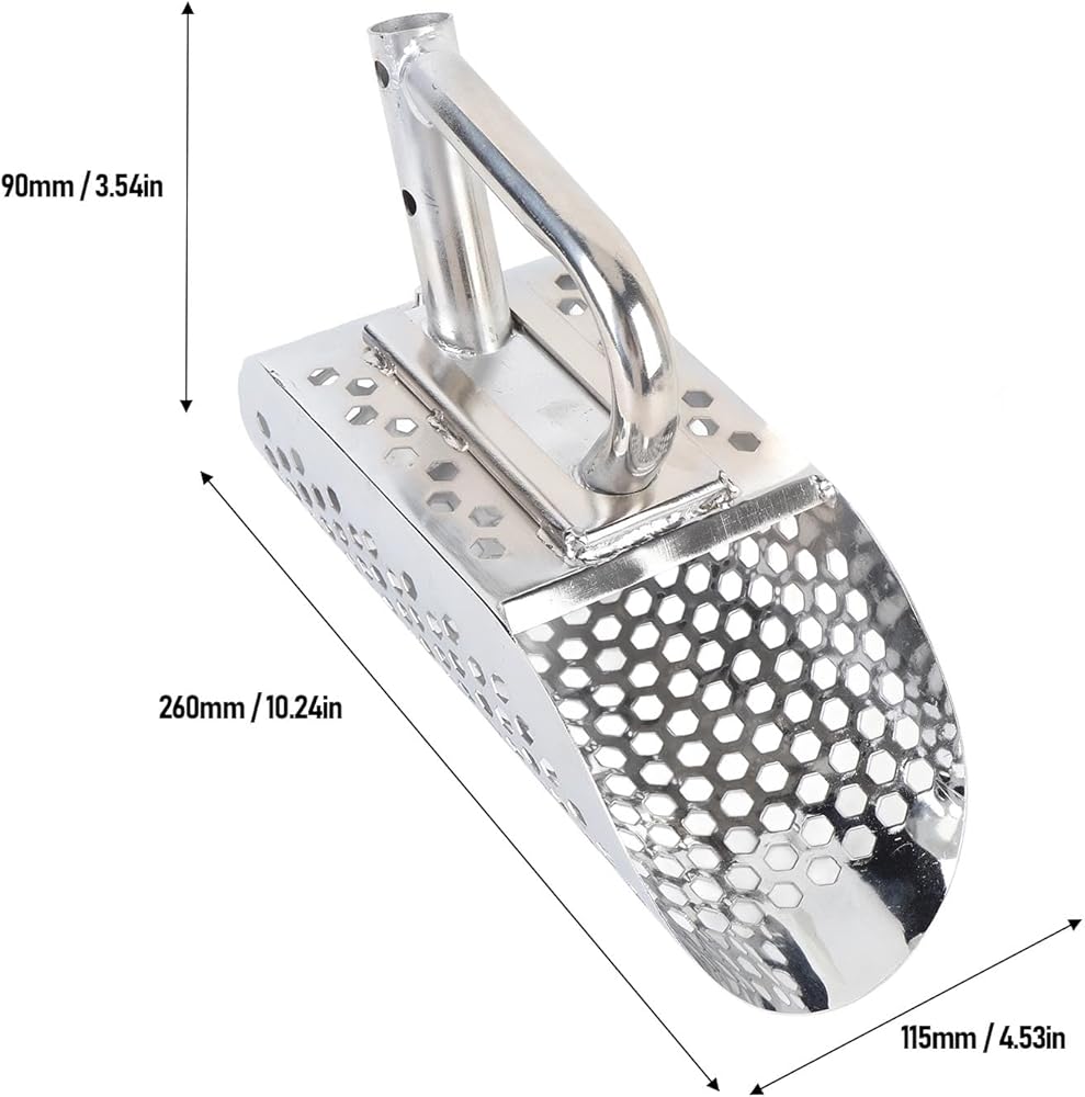 Metal Detector Sand Scoop: This sand shovel is made of stainless steel, ensuring that it will not rusting even with long term use on the beach. It is sturdy, and ideal for detecting metals in both sand and water. It measures approximately 10.24x4.53x3.54in.