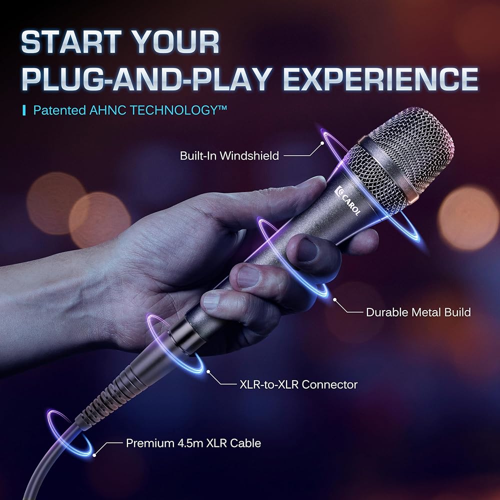 CAROL AC-910 XLR Wired Vocal Microphone – Dynamic Cardioid Mic with Dual-Engine AHNC Noise Cancelling Tech for Singing, Karaoke, Stage & Studio, Includes Microphone, Mic Clip & 14.8ft XLR Cable