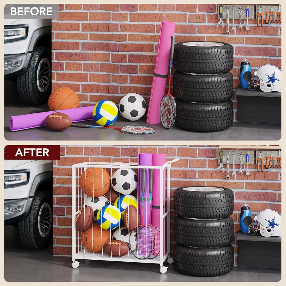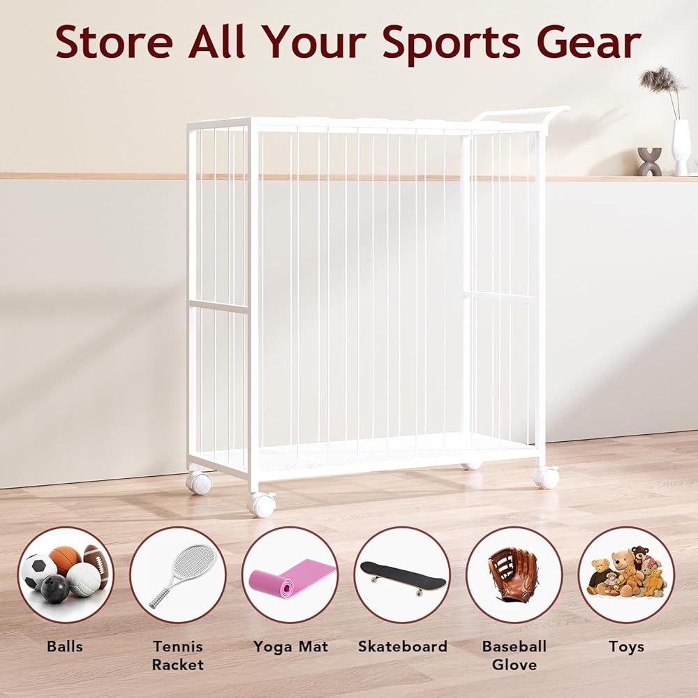 Ball Storage Bin Rolling Sports Ball Cart, Metal Garage Organizer Sport Rack, Ball Basket Storage, Ball Cage for Garage or Gym, Indoor & Outdoor Sports Equipment Organizer white