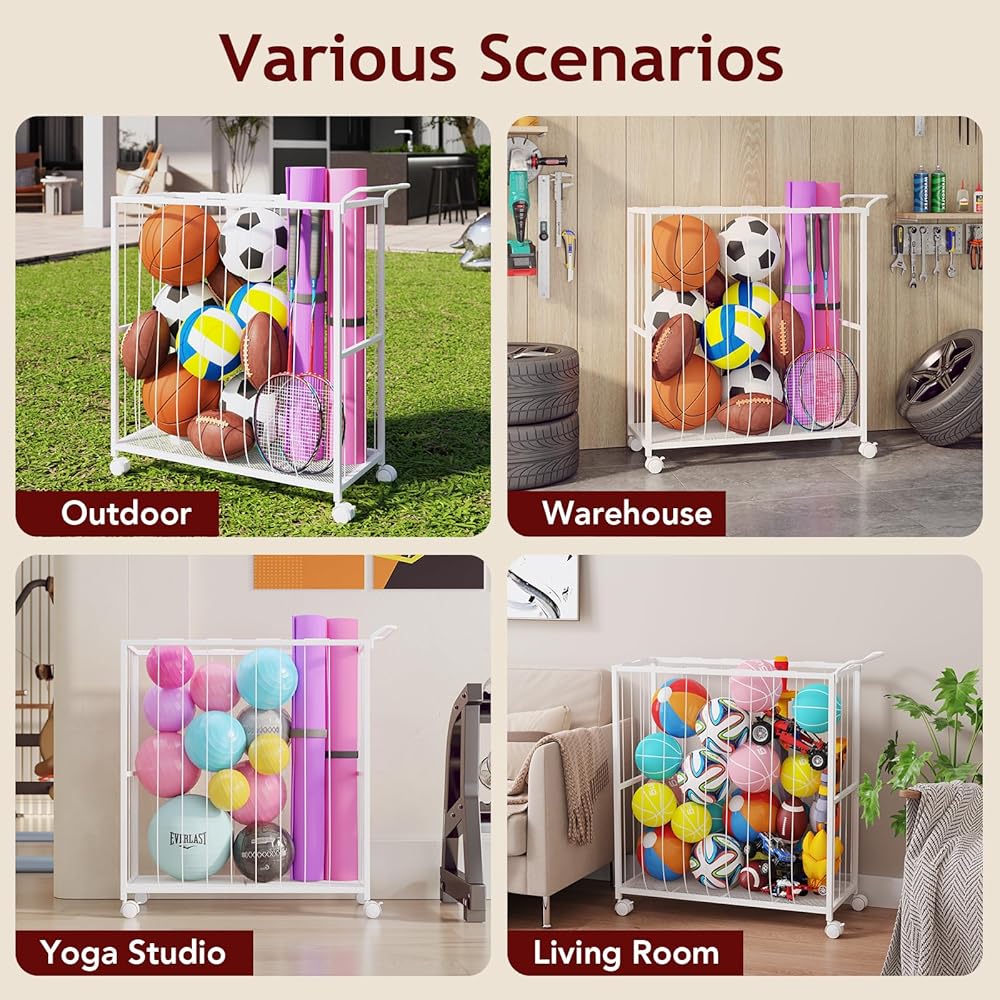 [Smooth Scroll Wheel] This rolling sports ball storage cart features four heavy-duty wheels, making it easy to move your sports bins indoors or outdoors. It's a convenient solution for storing basketballs, volleyballs, footballs, soccer balls, kids' toys, and more.