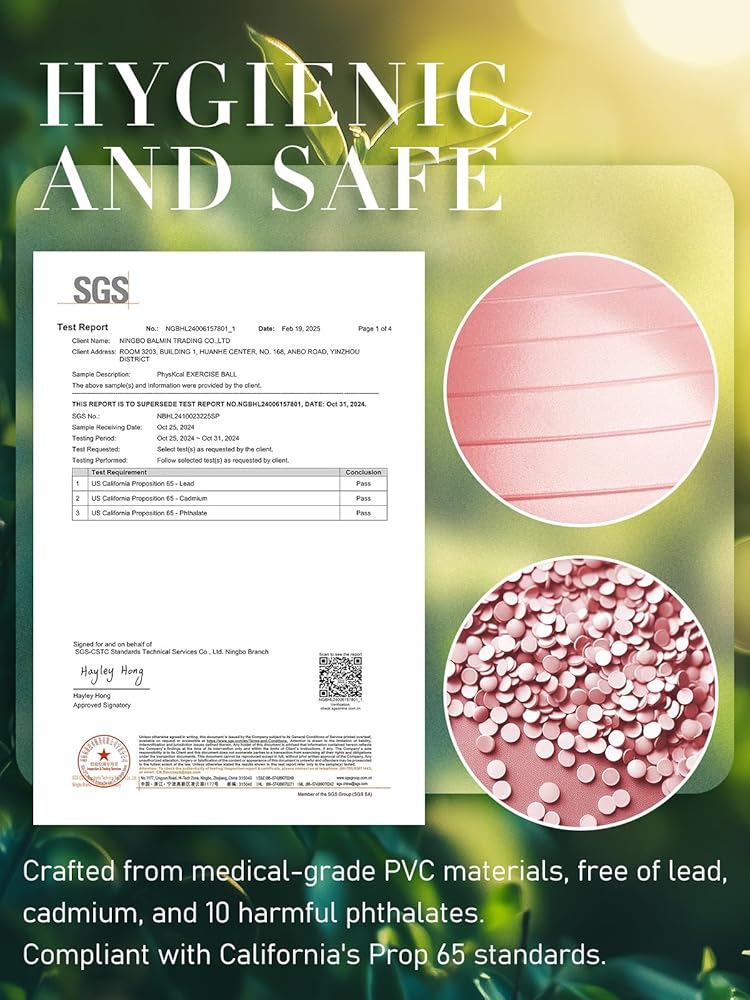 🤍𝐇𝐲𝐠𝐢𝐞𝐧𝐢𝐜 𝐚𝐧𝐝 𝐒𝐚𝐟𝐞- A gym ball, or also known as fitness ball, physio ball, yoga ball or balance ball is normally made of PVC. We upgraded the grade of PVC of our gym ball to a 16p-free level. It is free from phthalates, latex, BPA and other leading harmful chemicals, thus offering a safe and gentle support for exercise, seat and pregnancy.