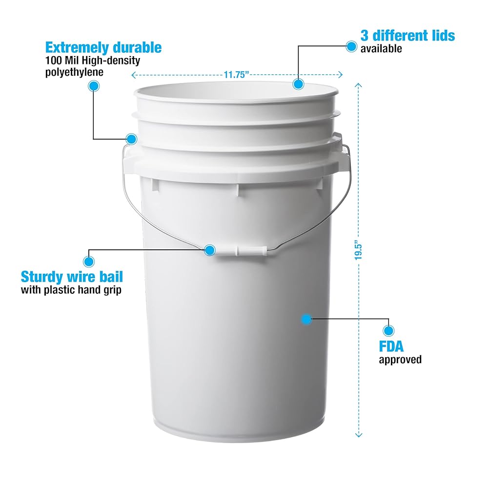These 7 gallon white hdpe buckets are extremely tough. 100 mil construction allow for these buckets to be used over and over again. Sturdy wire bail with a plastic handgrip is attached to the bucket. Practical fill is 7.00 gal. (26.50 liters) and overflow fill is 7.39 gal. (27.97 liters). Meets standards. Can be used to pick up baseballs after a game. Package contains one bucket and one lid.