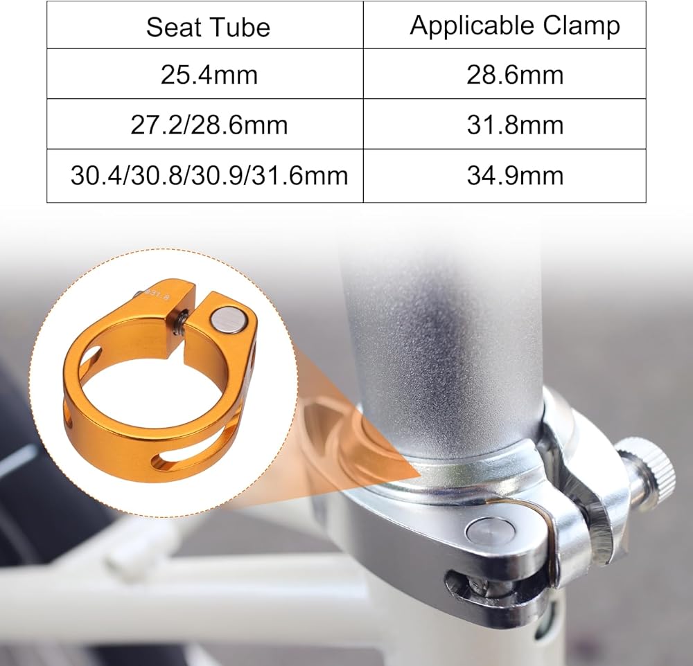 Note - Our seat post clamp has three sizes for you to choose from, the 28.6mm clamp is suitable for seat post diameters of 25.4mm, the 31.8mm clamp is suitable for seat post diameters of 27.2/28.6mm. and the 34.9mm clamp is suitable for seat post diameters of 30.4/30.8/30.9/31.6mm.You need to confirm the seat post label or seat post size before purchasing the seat post clamp, and finally choose the appropriate bicycle seat post clamp.