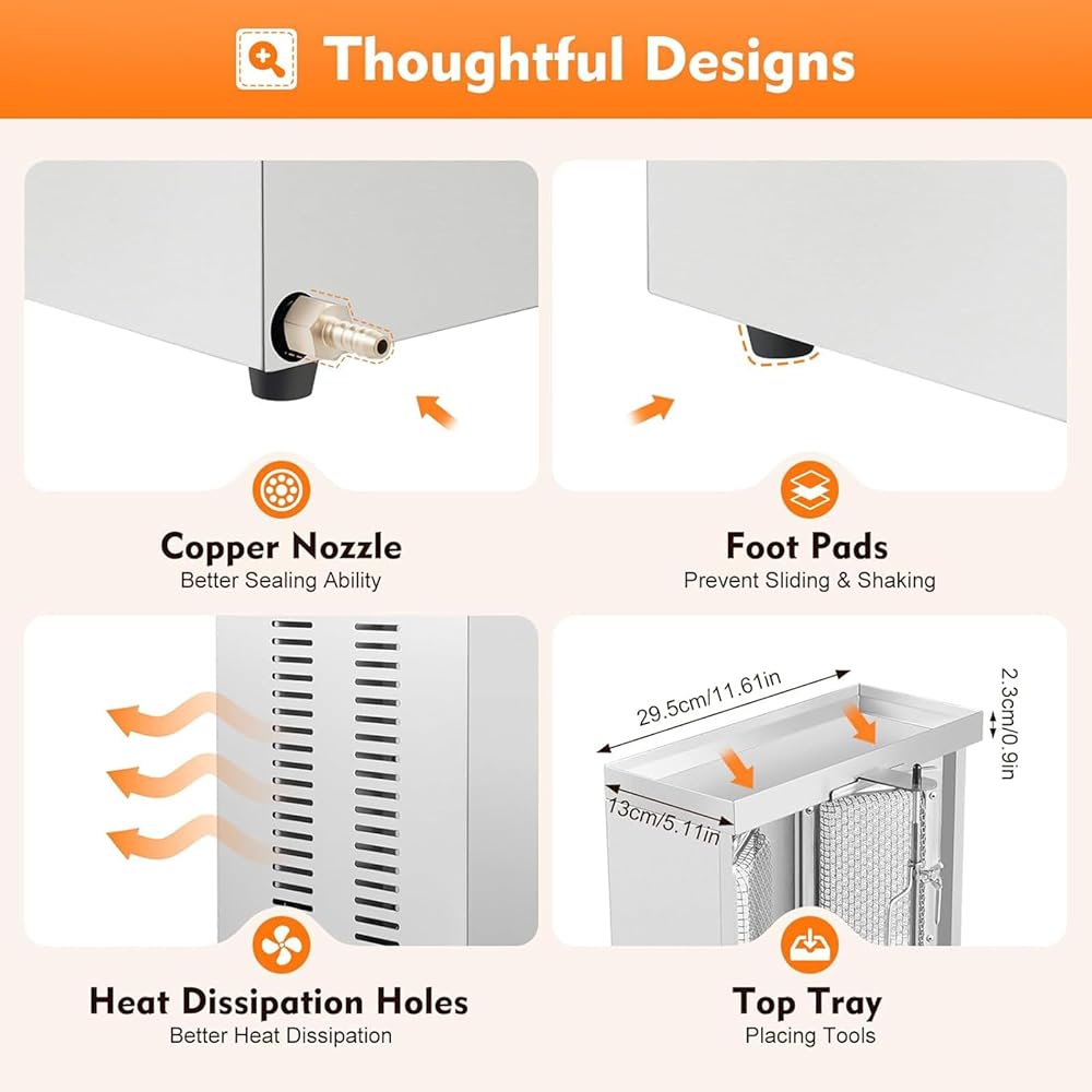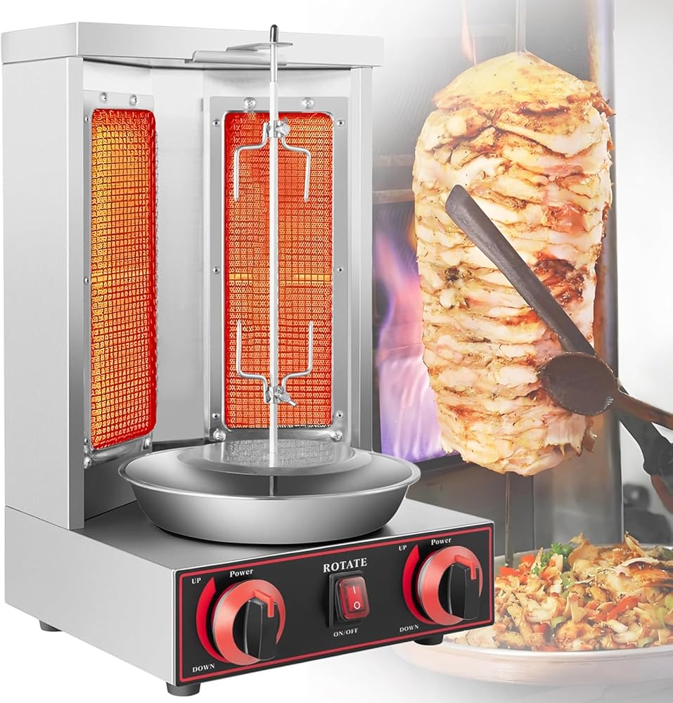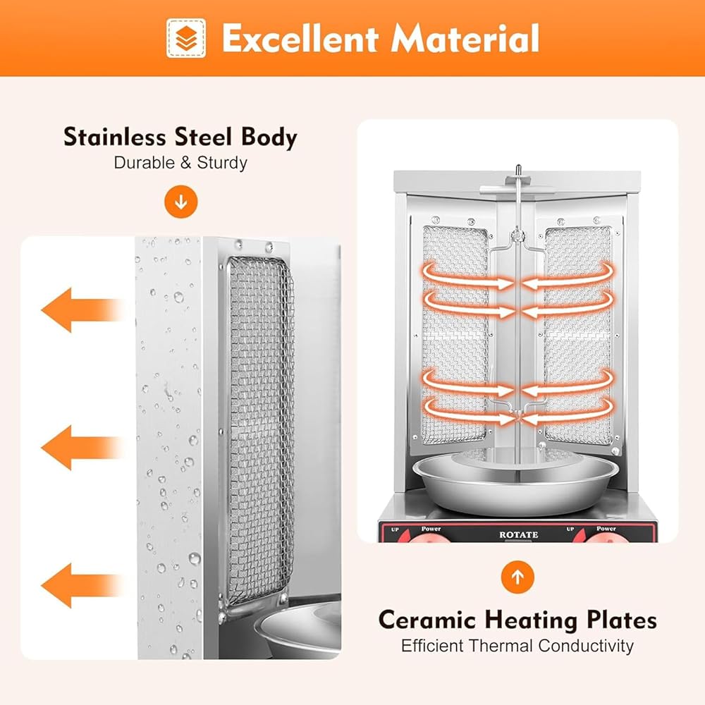 Experience the joy of perfectly cooked meat with our innovative vertical countertop rotating rotisserie oven. Designed to enhance your cooking experience, this appliance features dual-flame 3D heating and 360° even rotation, ensuring that your favorite barbecue dishes, kebabs, and shawarma are grilled to perfection every time. Our rotisserie oven utilizes dual infrared heating plates, which work in tandem with the rotation function to deliver consistent heat distribution, eliminating the frustration of unevenly cooked meat. Say goodbye to the hassle of charcoal and the associated fumes, as this hygienic appliance heats up quickly and reaches temperatures between 50-300°C, making it ideal for both casual home barbecues and larger gatherings. With a generous capacity of 17.64 pounds, this versatile grill is perfect for hosting picnics, backyard parties, or even for commercial use. The removable stainless steel skewer makes it easy to load and unload your meats, while also allowing you to adjust the height for optimal cooking. Cleanup is a breeze too, thanks to the tray that catches drippings, keeping your cooking area tidy. Specifications include a robust stainless steel frame, low-pressure fuel compatibility, and a powerful 3000W output, available in both 110V and 220V options. The compact design, measuring 29.5 x 30 x 48.5 cm, makes it a practical addition to any kitchen or outdoor setup. Included in the package are the gas doner kebab machine, power cable, gas hose, low-pressure valve, and a user manual. Please remember to follow safety guidelines, such as closing the gas valve after use and avoiding flammable materials nearby. Transform your cooking with our gas Middle East BBQ grill and enjoy delicious, evenly cooked meals that will impress family and friends alike! If you have any questions, feel free to reach out via email; we are here to assist you within 24 hours.