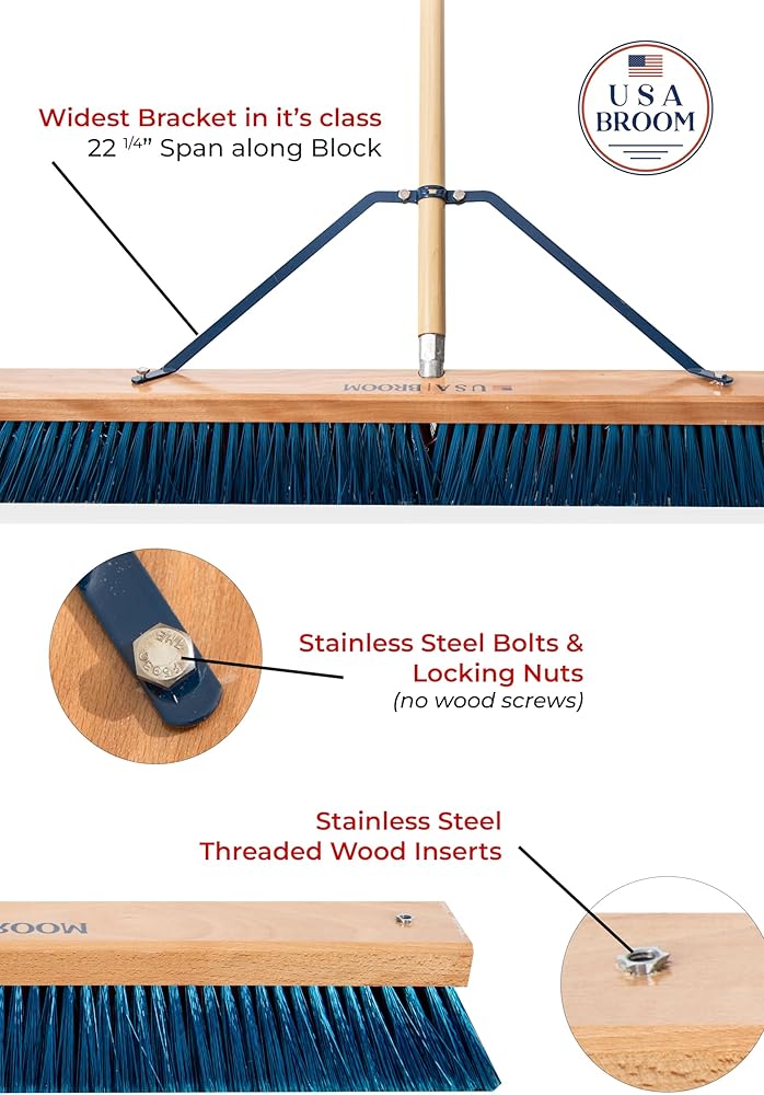 Durable Design for all day sweeping- Equipped with Non-Twist Talon Grip 22" Brackets, which are the widest brackets in its class. Designed with a 1 1/8in x 60in natural poplar hardwood handle. Fashioned with a custom vynafoam grip for comfort and strength.
