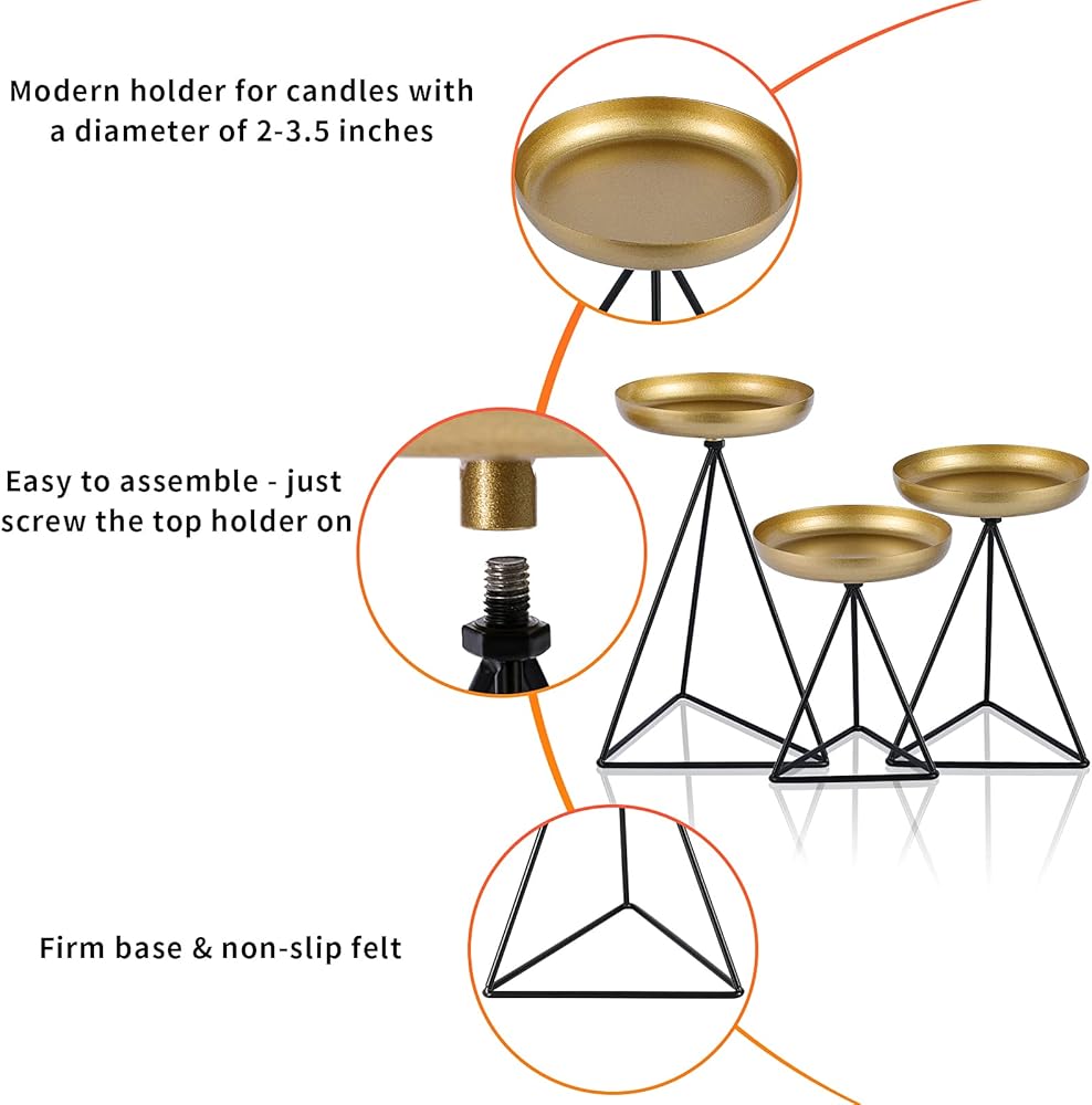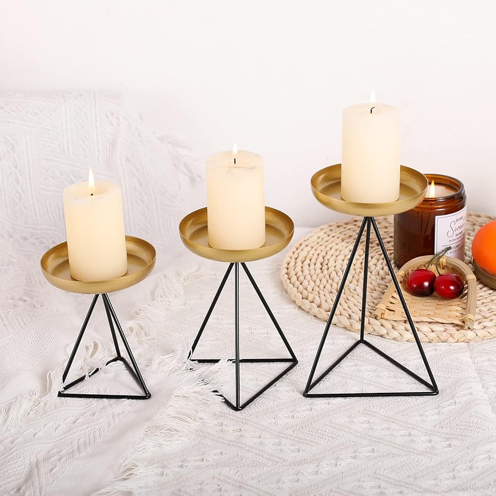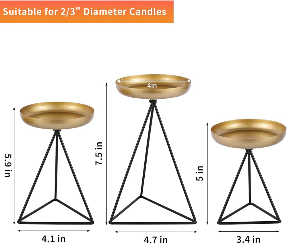 【Perfect Size Fit for Pillar Candles】The base diameter of three are 4.7", 4.1", 3.4" respectively, the heights of triangular stands are 7.5", 5.9", and 5" respectively. The inner diameter of the candlestick plate is 4", suitable for 2-3" D candles
