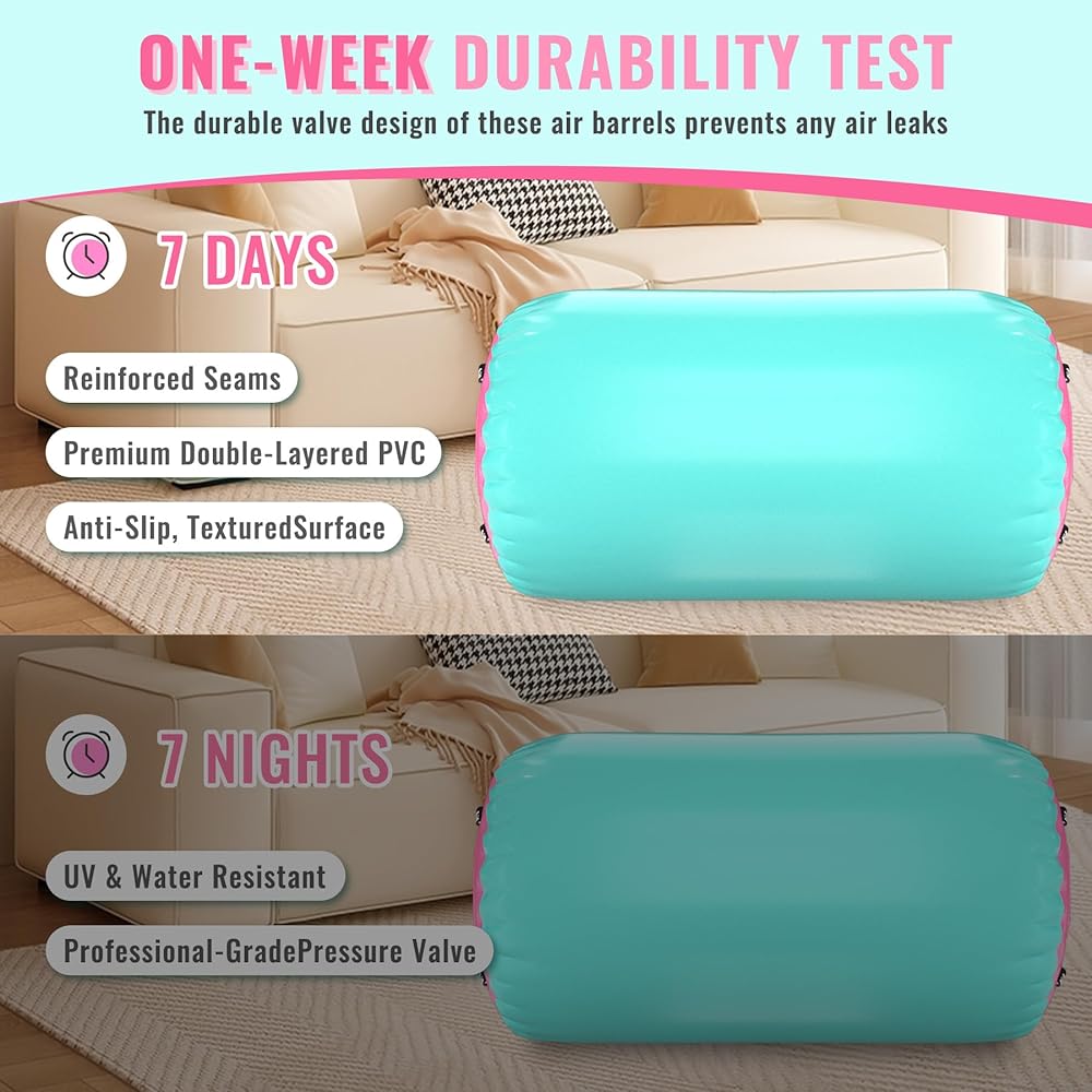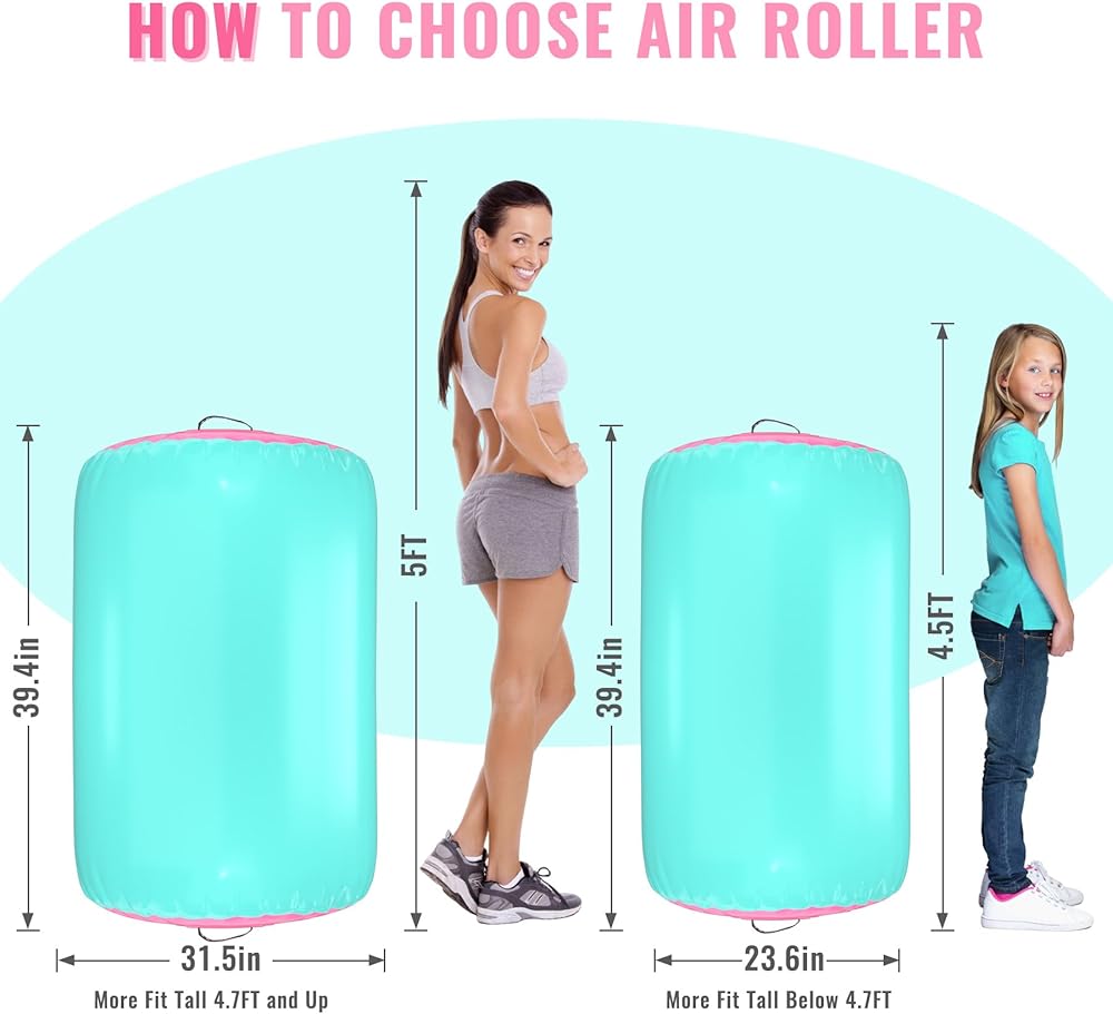 Professional Air Roller: The inflatable air barrel mats is elastic, which makes easier for you to complete many difficult gymnastics skills, such as tumbling moves, front handsprings, back handsprings, leaps, cartwheels, over splits, vaulting, reduce the risk of injury and increases the repetitive frequency. Suitable for any beginners or young gymnasts