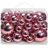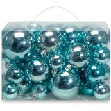 Sizes and types: 18 aluminum hanging strips of 7”; 12 balls of 1.57”,12 balls of 1.97”,12 balls of 2.36”; 6 stars of 2.8”, 6 pine cones of 3.15”, 5 houses of 2.8”, 5 gift boxes of 1.97”, 4 stockings of 3.9”, 4 tapered ornaments of 3.9”, 4 glazed icicles of 3.15”, 2 poinsettia flowers of 3.15”.