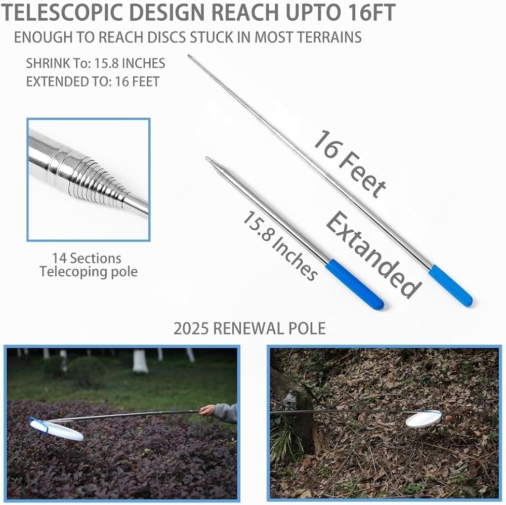 𝐔𝐥𝐭𝐢𝐦𝐚𝐭𝐞 𝐃𝐢𝐬𝐜 𝐑𝐞𝐭𝐫𝐢𝐞𝐯𝐞𝐫 𝟏𝟔𝐅𝐓 𝐑𝐞𝐚𝐜𝐡 & 𝐑𝐮𝐠𝐠𝐞𝐝 𝐁𝐮𝐢𝐥𝐝: This XL disc golf retriever extends up to 16 feet and collapses to just 16 inches perfect for water, mud, trees, or rocks. Built with durable, rust-resistant FRP, it's non-conductive and weatherproof for year-round use. A must-have tool that keeps your game going and your discs safe.