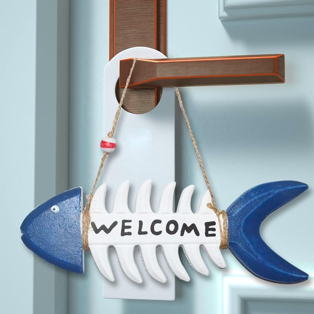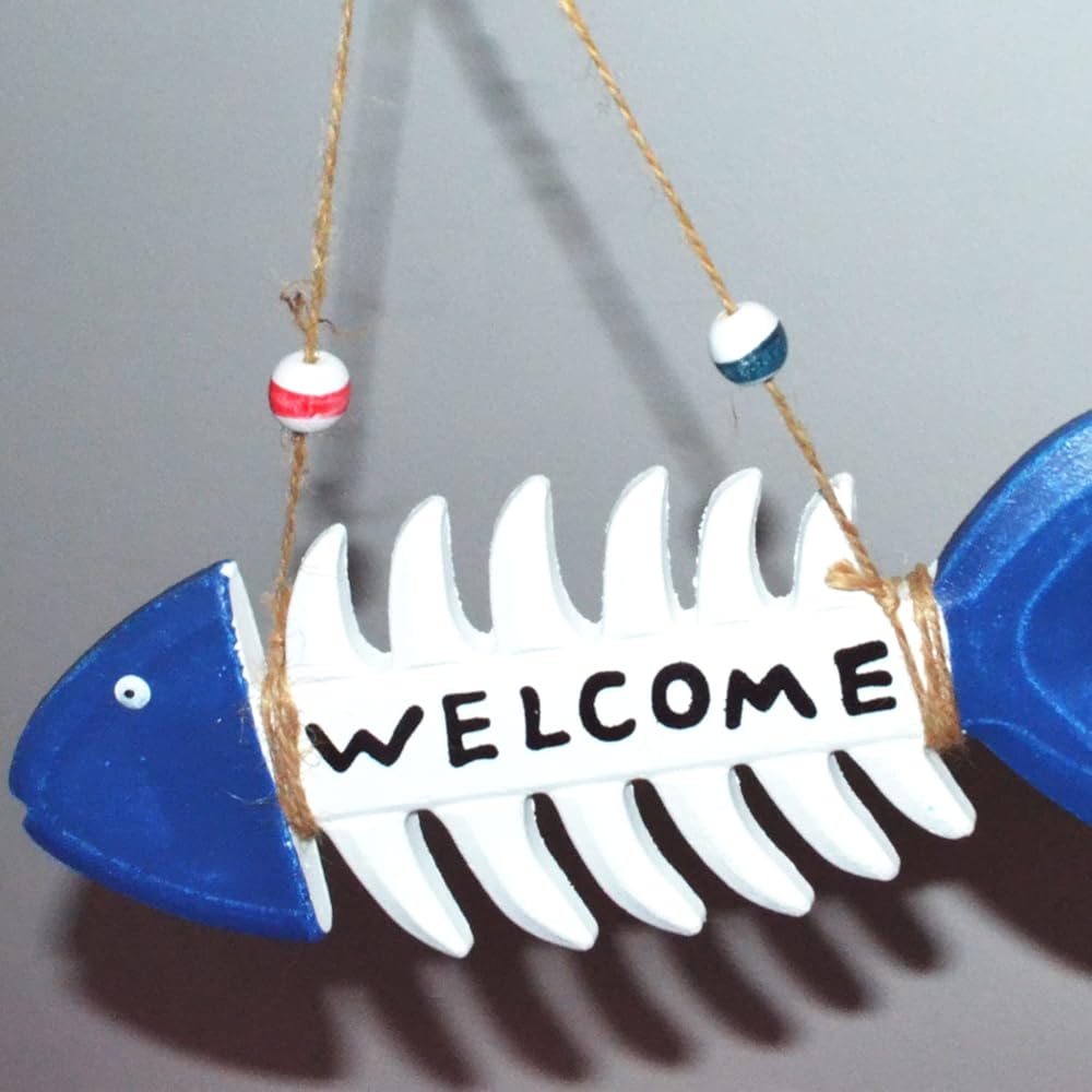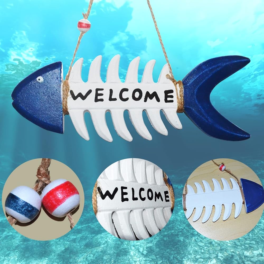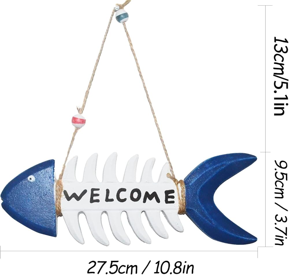 Fish Wall Decor Coastal Welcome Sign Wall Art Nautical Themed Beach Ornament for Home Door Porch Vintage Navy White Fish Skeleton Wall Hanging Mediterranean Room House Outdoor Decorations 10.8x3.7"