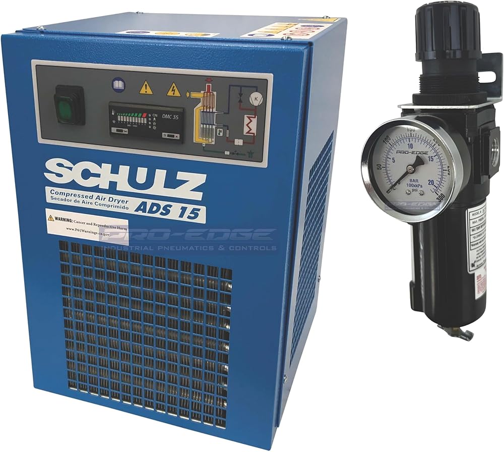 15 CFM Schulz Heavy Duty Compressed Air Refrigerated Air Dryer and Industrial Grade Arrow Pneumatics Integral Moisture Removing Particulate Filter / Pressure Regulator. Equipped with 3u Micron Filtration rating 10-250 PSI Air Pressure Regulator with 2.5" Pressure gauge. Installation Fittings also included.