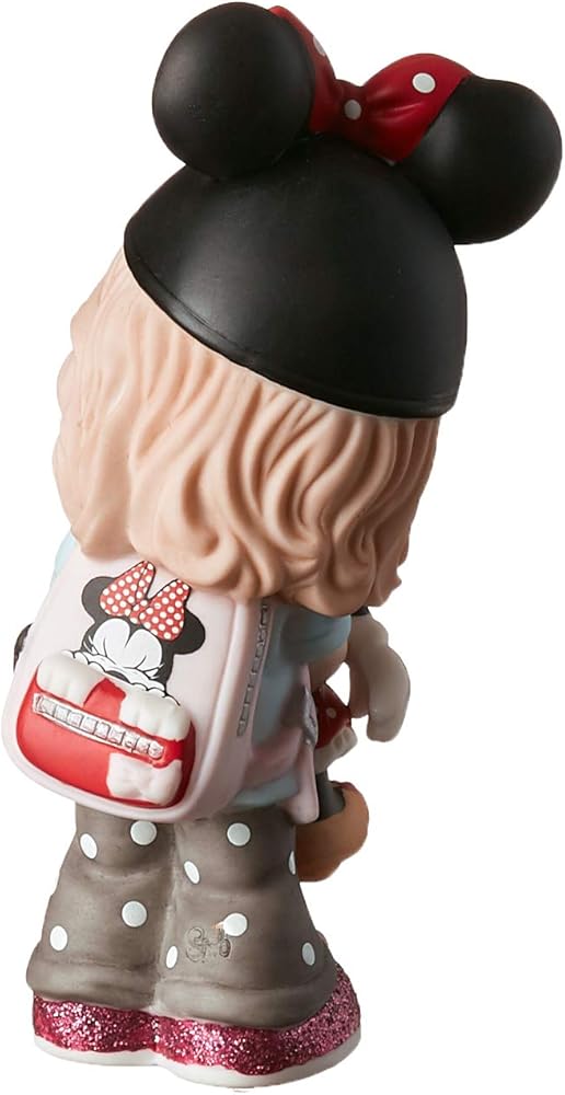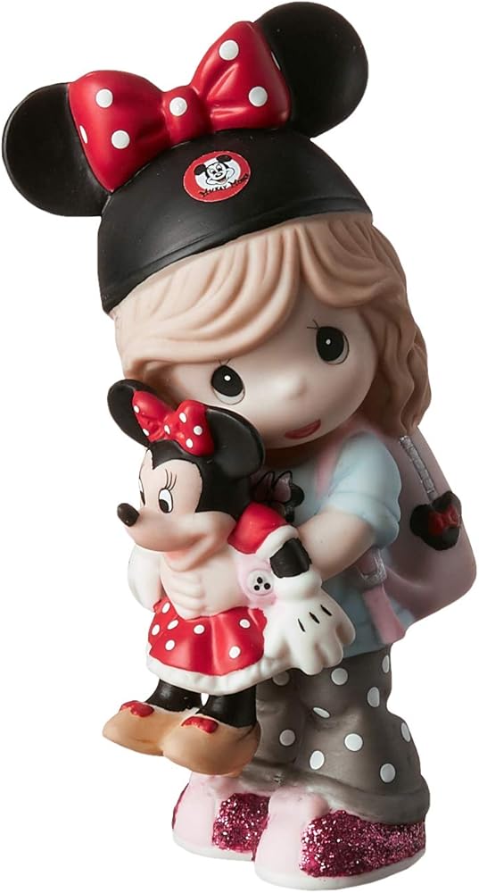 This Precious Moments girl is a Disney Minnie Mouse fan extraordinaire! Dressed in her Minnie Mouse hat backpack shirt and wristwatch she's ready for a magical day with her toy Minnie Mouse