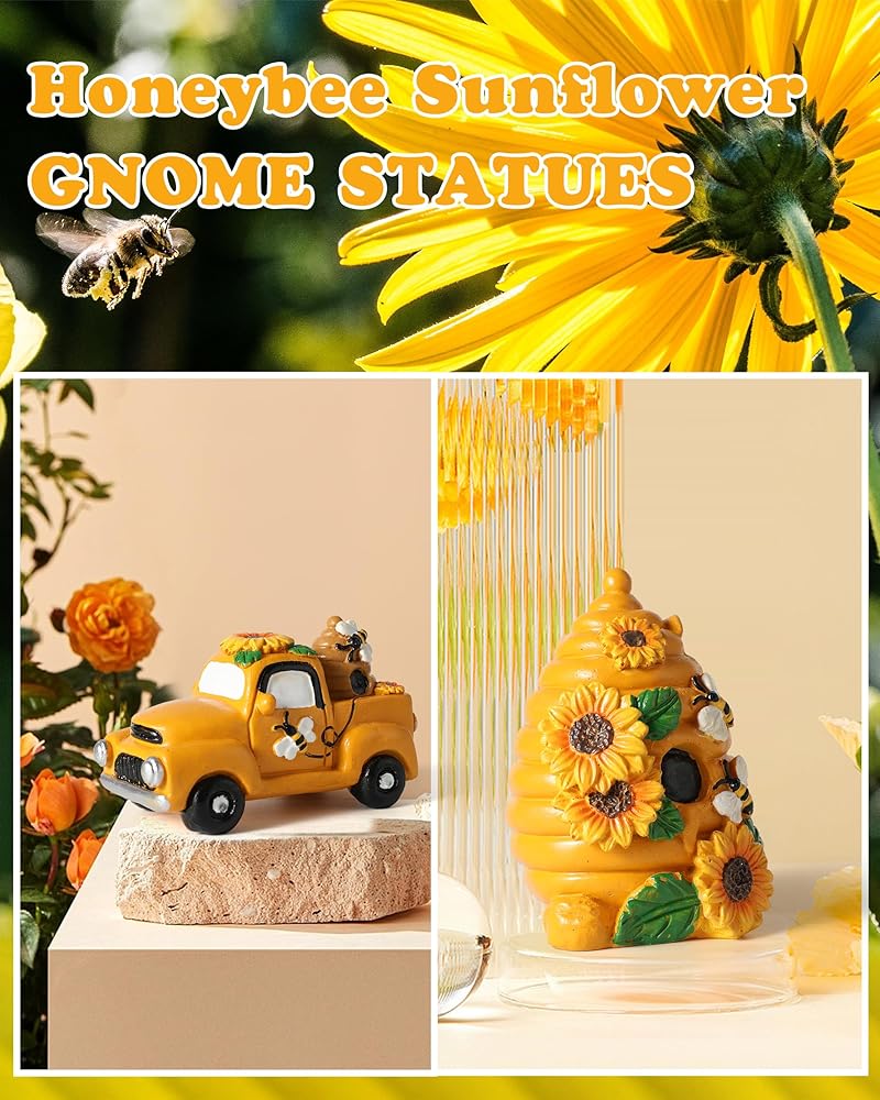 Add some vintage charm to your home with these adorable bumble bee decor. These cute and colorful figurines feature a bumble bee driving a vintage truck or car with honeycomb and sunflower details.