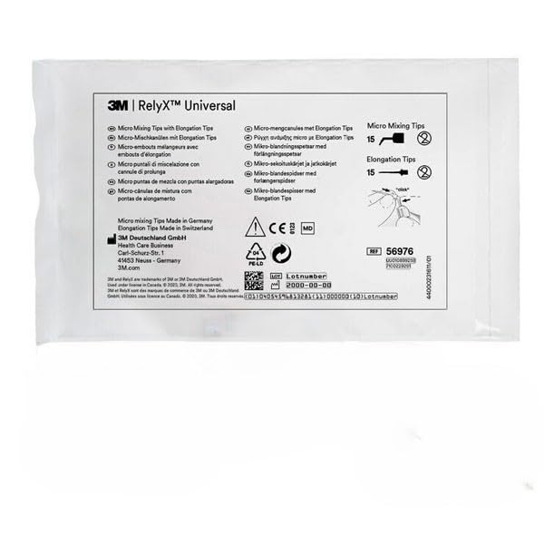 3M RelyX Universal Micro Mixing Tips with Elongation Tips 15/Pk. 80% Less Waste compared to standard automix systems. Suggested applications include: Automated mixing of 3M RelyX Universal Resin Cement and direct application to restorations, preparations, and easy cement application into the root canal. Used with RelyX Universal self-adhesive resin. For direct and accurate dispensing. Ensures optimal consistency. Guaranteed less waste. RelyX Universal Micro Mixing Tips are plastic, curved points used to reduce RelyX Universal Resin Cement waste by 80% by directly targeting the desired area. It houses Elongation Tips which are thin, long, and straight for precise root canal applications.RelyX Universal Resin Cement is an adhesive that works as a universal primer for all materials and is compatible with all direct and indirect bonding indications. It is effective as a standalone self-adhesive and also with Scotchbond Universal Plus Adhesive.RelyX Universal Cement is an all-in-one radiopaque adhesive that handles easily and does not require light-curing. Each pack contains 15 RelyX Universal Micro Mixing Tips with Elongation Tips.
