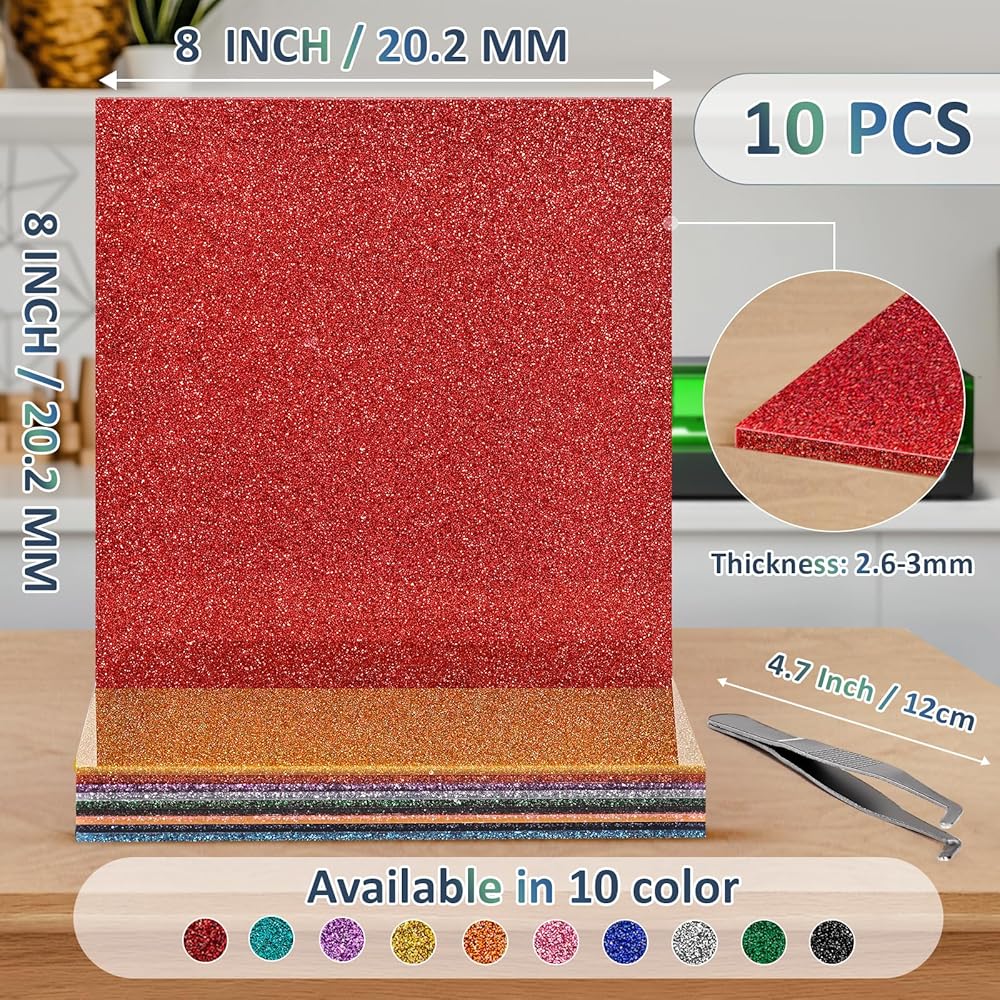 COLORFUL ACRYLIC SHEETS: Each piece is individually inspected for flawless quality, contains 10 pieces acrylic sheets and tweezers, tweezers make it easy to remove the protective coating from the film, size: 12x12x1/8 in 30.2cm x 30.2cm x (2.7-3mm) thick, manual thickness measurement, please allow for a positive and negative tolerance of (0.1-0.3mm), 10 colorful: red/pink/purple/black/orange/blue/green/yellow/cyan/white, acrylic sheets bulk meet your various DIY project needs