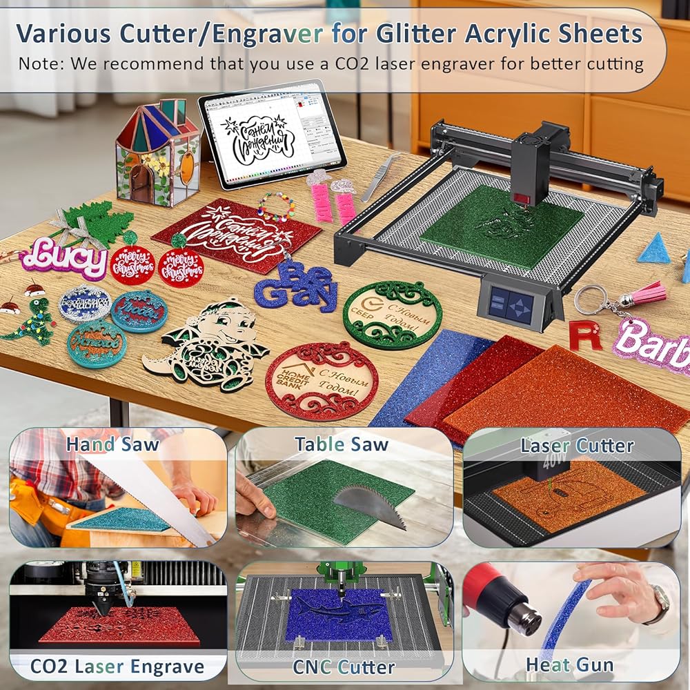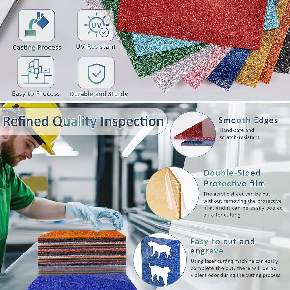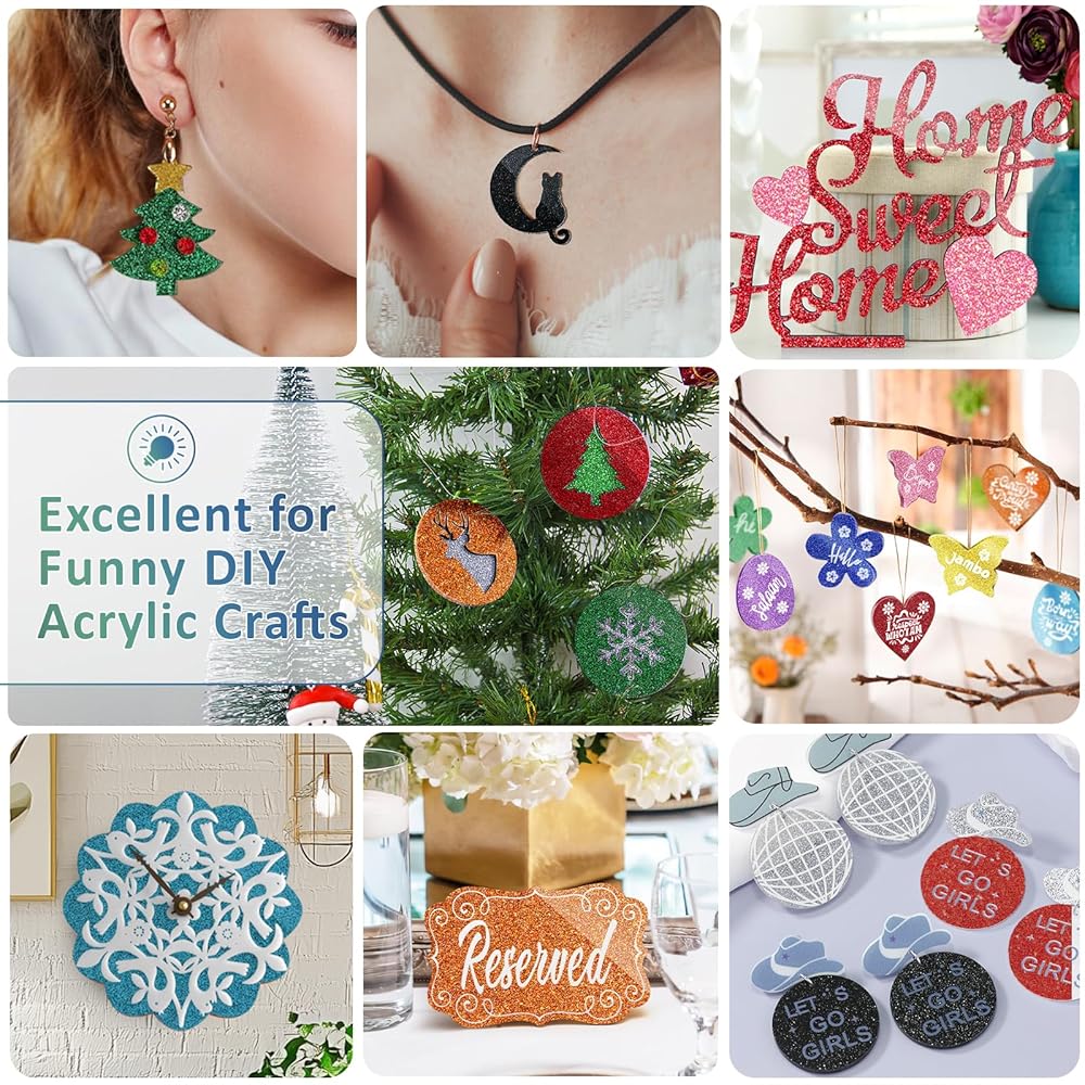 WIDELY USEGE: The glitter acrylic sheet can be used to make various crafts, jewelry, home decor, home holiday decorations, signs, photo frames, pet tags, display stands, cake toppers, photography, stand-up signs, desktop protectors, stage performance, model building, stand-up signs, desktop protectors and others crafts