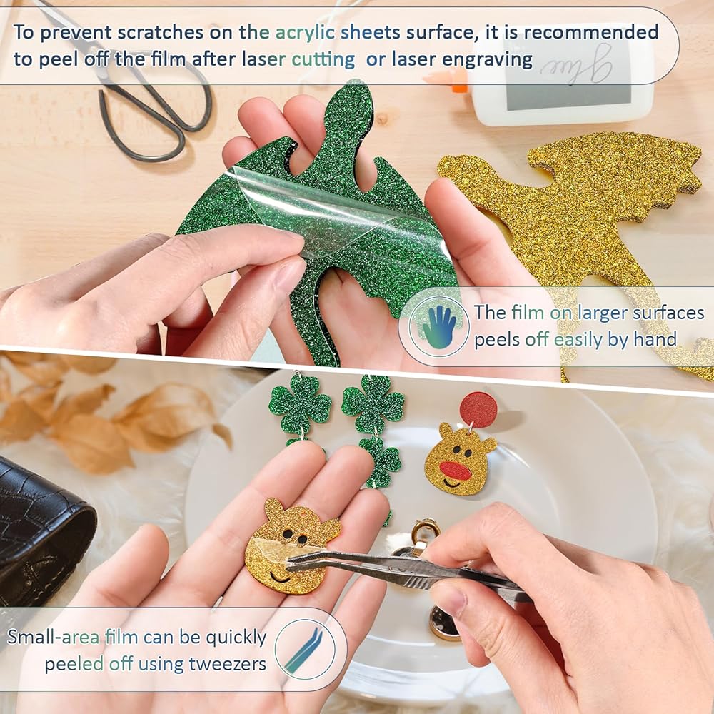 PROTECTIVE FILM DESIGN: The acrylic sheets both sides have paper backed protective coating, will not be scratched during cutting and engraving, do not tear off the paper when laser engraving or cutting, just tear if off after finishing the work