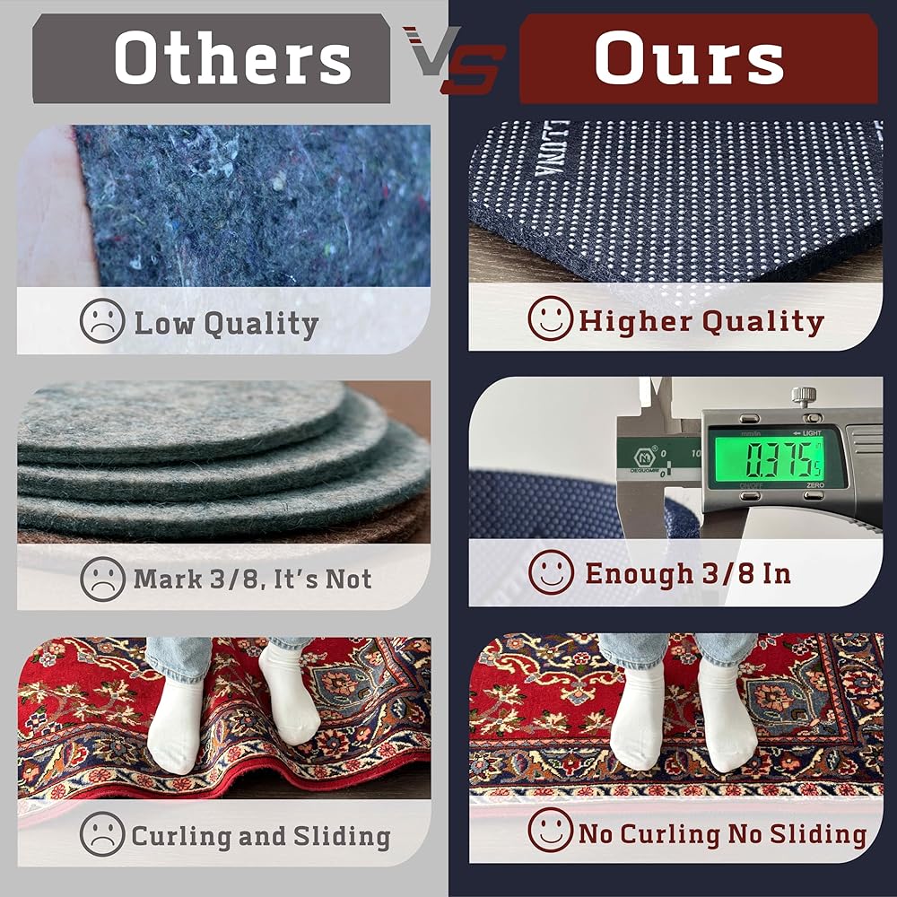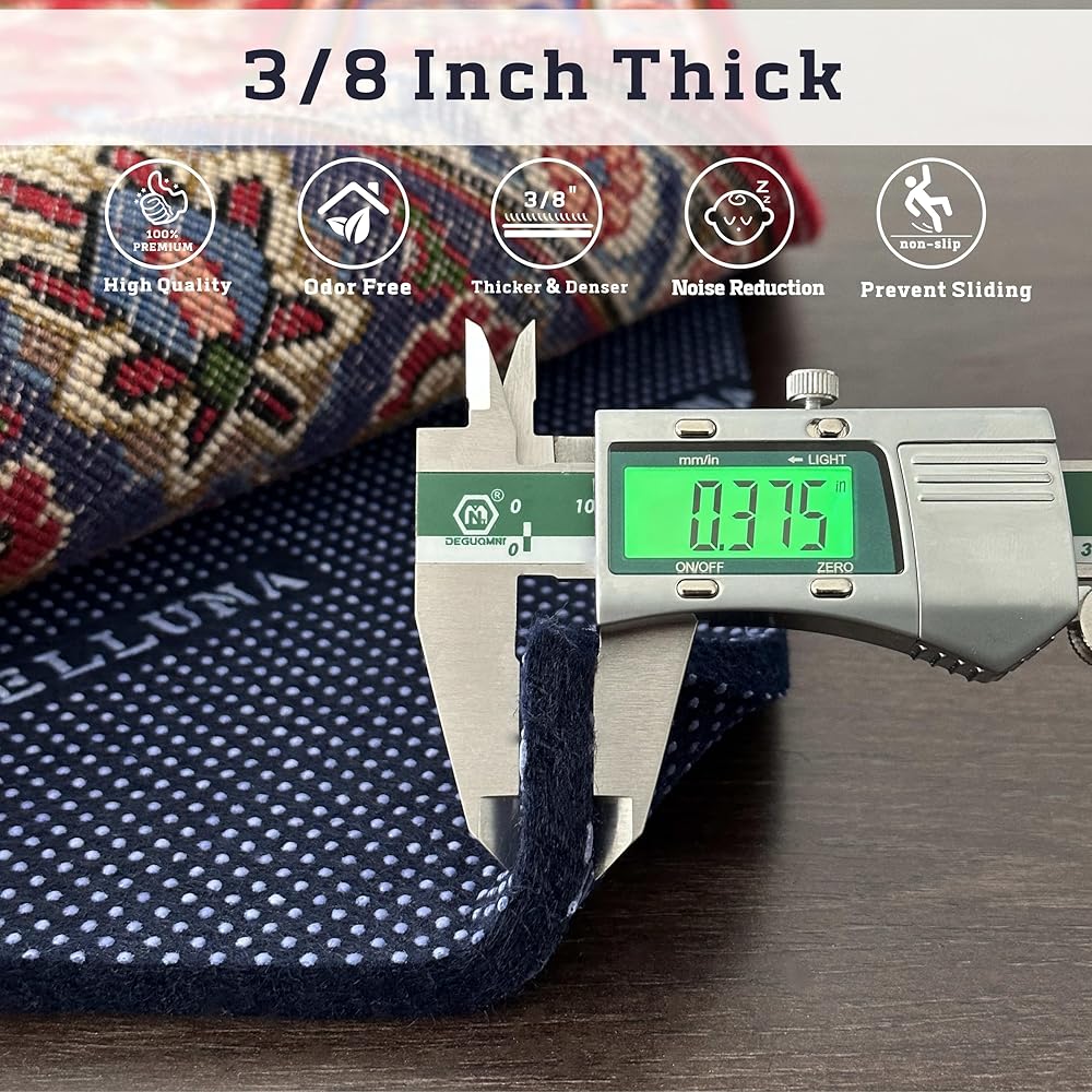 【THICKENING - COMFORTABLE 】 The mat contains 49 oz of felt. The thickness reaches 3/8 inches for those looking to maximize cushioning and comfort. It is thicker than most rug pads on the market. High-density thickened heat-pressed felt adds soundproofing and insulation. Provide a thick and soft luxury feeling under your feet.
