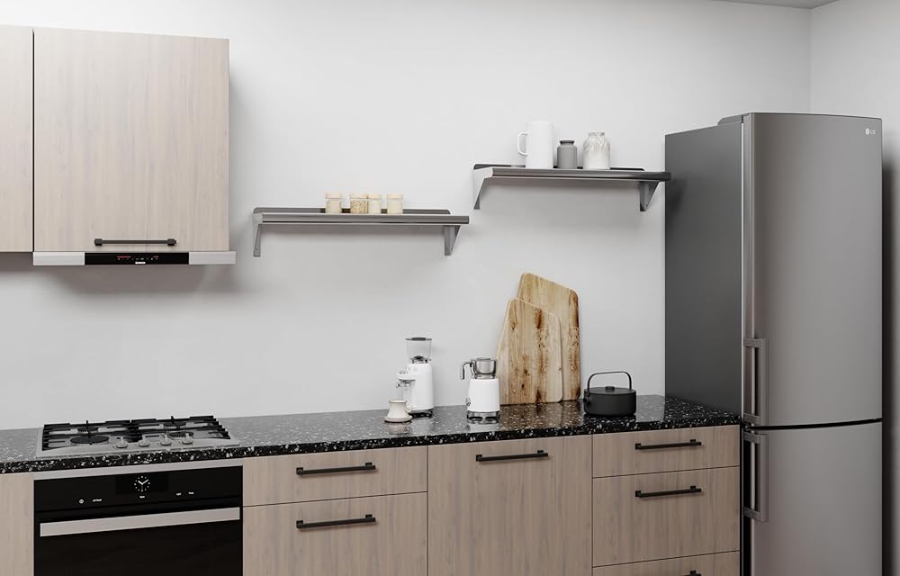 Stainless steel wall shelves are commonly used for food prep in a commercial kitchen, and in many other residential, commercial and industrial applications.