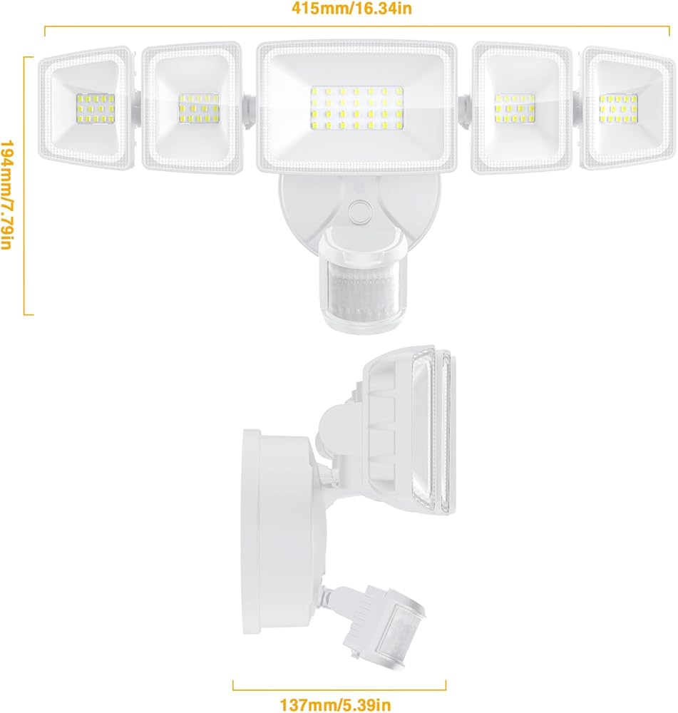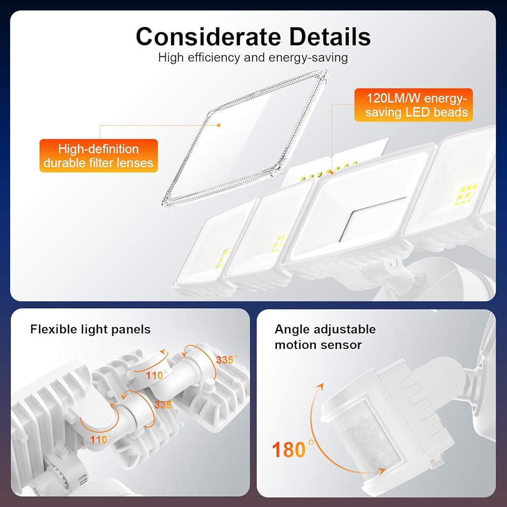 Ultra Wide Lighting Range: With the rotation of five individual positioning lights and motion sensor, you can easily brighten up the area where you want and the total lighting area up to 1230 sq.ft; Trust us, you will love the all adjustable sensor light