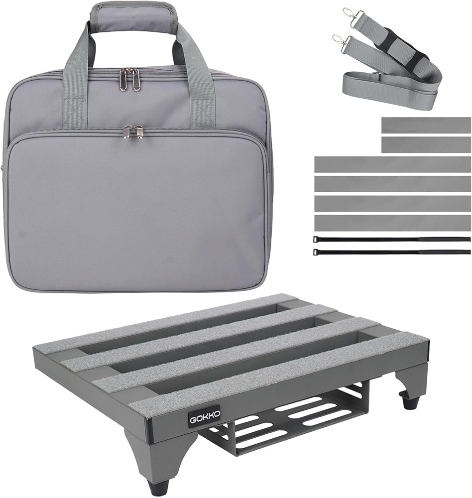 3.3 lb - 22 x 12.6 inches supper light aluminum alloy guitar pedal board. It has a bracket for mounting large size power supply. It comes with sturdy carry bag, shoulder strap, tapes for mounting pedals.