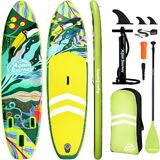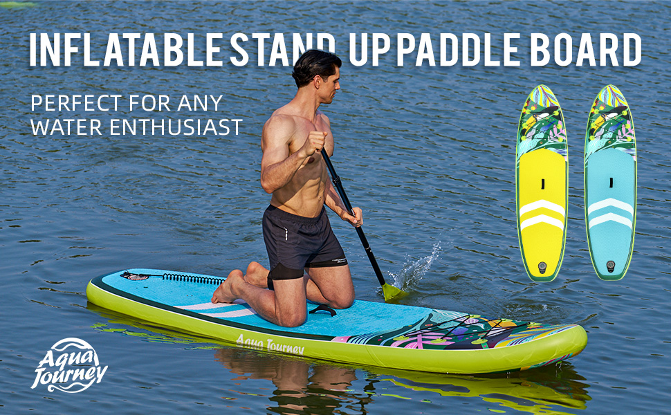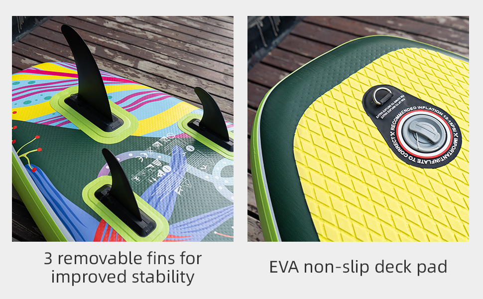 This inflatable stand-up paddleboard features exquisite graphic designs and high-quality accessories. The standing area is made of premium EVA non-slip material, ensuring safety and durability during use. The front is equipped with 6 D-rings, and the 3 fins at the tail provide enhanced stability and gliding speed. The advanced air pump comes with a pressure gauge, allowing for quick and easy inflation while enabling real-time monitoring of air pressure. This is a multi-functional SUP, ideal for water yoga and Pilates. Its wide hull offers greater stability, making it suitable for various water conditions. It brings excitement and relaxation to family trips and outings. All products: 1x Inflatable Board 1x SUP hand pump 1x Detachable combined paddle 1x Backpack 1x Ankle leash 3x Detachable Fins 1x Repair kit (no glue) 1x Instruction manual Inflatable SUP Boards Maintenance: 1. Stand Up Paddle Board Storage: rinse your board with fresh water, dry completely, fin off, store deflated and out of sun. 2. Avoid long time constant overexposure to the merciless sun to protect the sup board from warping. 3. Pet: Trim your dog's nails or put a traction pad on if he stands in front of the SUP paddle board.