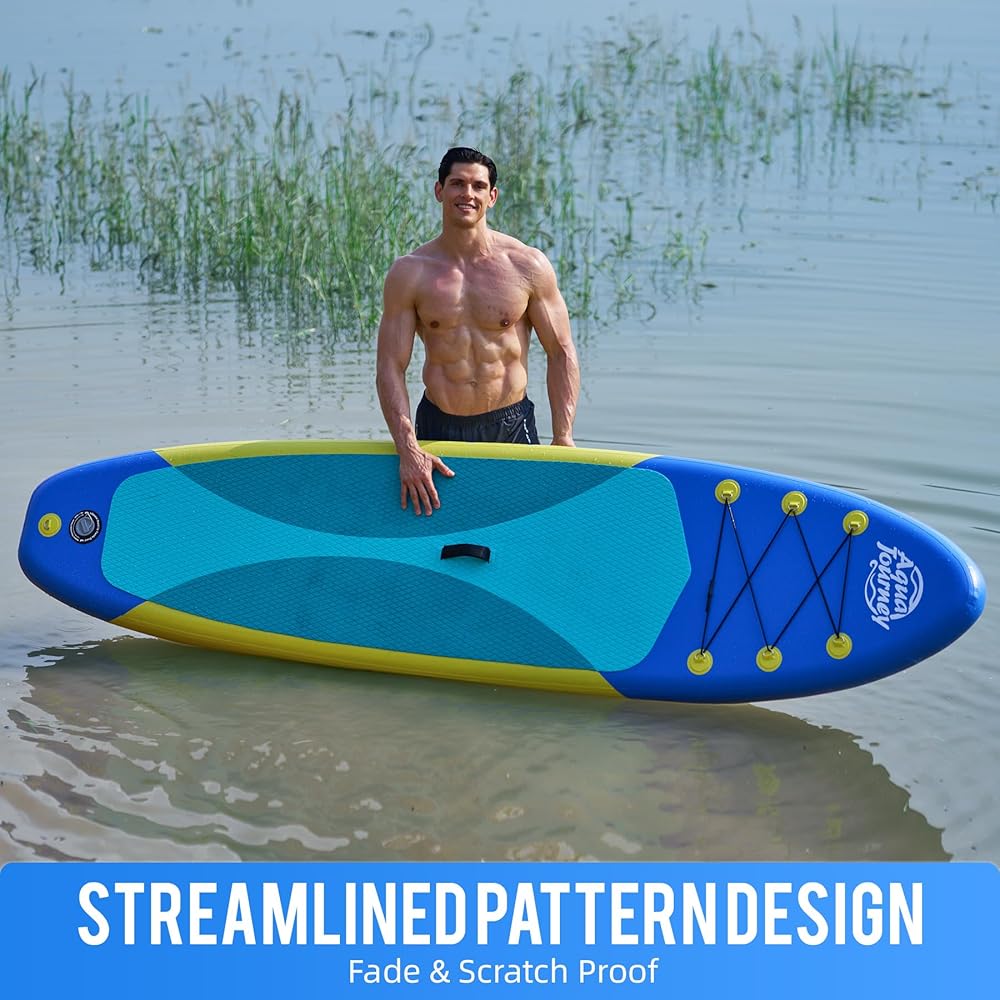 【Complete Premium SUP Package】Everything Included to Hit the Water: Your Aquajourney kit comes fully equipped: 1x inflatable SUP board, 1x adjustable SUP paddle, 3x fins (1 removable main fin + 2 fixed side fins for superior maneuverability), 1x high-pressure pump, 1x coiled safety leash, and 1x lightweight backpack for travel-ready portability.