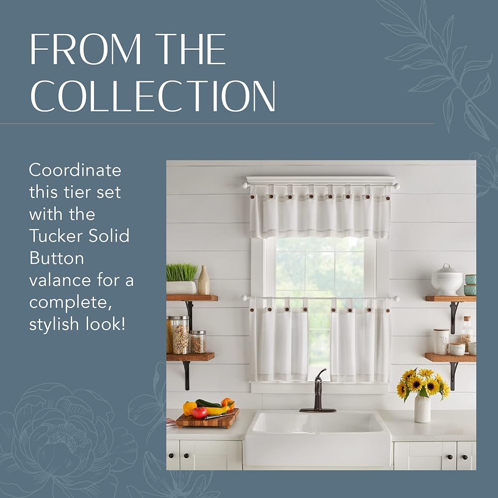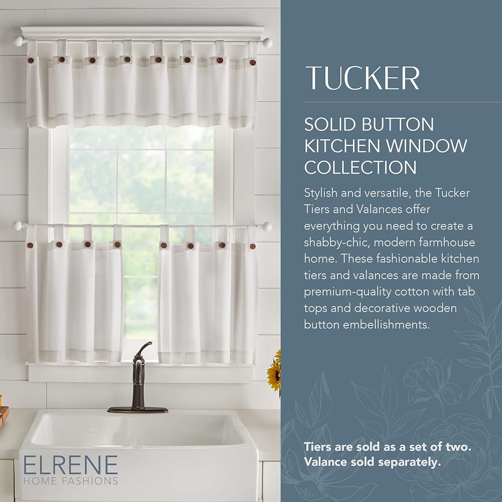 Elrene Home Fashions provides beautifully fashionable home decor to suit any decorating taste. Capture that shabby-chic farmhouse style with the Elrene Home Fashions Tucker Solid Button Tier Window Curtains for your kitchen, café, or bathroom. Easy to hang, each curtain has 3-inch tabs that will fit up to a 1-inch-diameter curtain rod. The trendy color and design and cute wooden button accents give a touch of easy sophistication to your windows and your home. Available in a variety of colors, this 2-panel set adds a flawless, classy look to any room. Coordinate to Tucker Solid valance, sold separately.