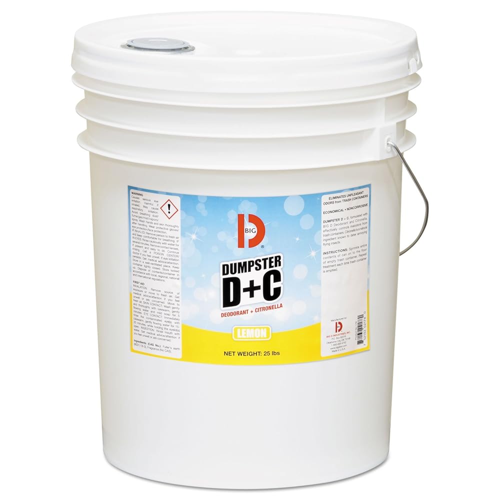 Big D Dumpster D plus C is formulated with special odor absorbing granules and Citronella (proven to deter annoying flying insects). This unique and safe formula is long-lasting and neutralizes odors on contact. Use to quickly and effectively deodorize garbage dumpsters, trash cans, containers and compactors, and garbage collection trucks. Product is useable for restroom, schools, food service and transportation sectors.