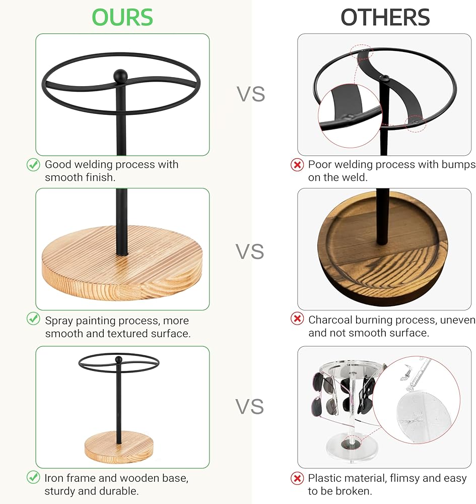 Safety & Practicability : Featuring a wooden round weighted base which is more stable and sturdy, evenly distribute pressure that makes it stands steadily and not easy to fall. Also the metal material with a smooth finish, will not rust and scratch your glasses. Note: The sunglasses display stand cannot be rotated.