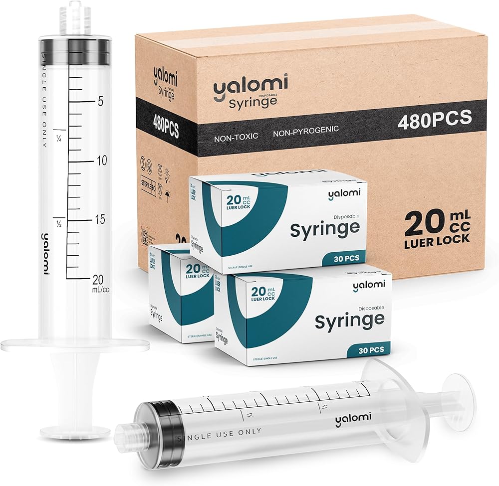 Yalomi 20mL (20cc) Luer Lock syringes provide precise liquid measurement for scientific, veterinary, and industrial applications.