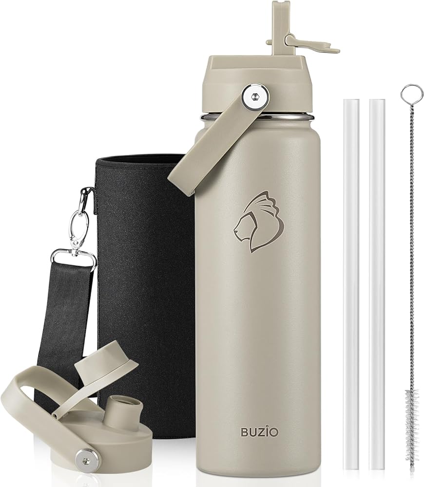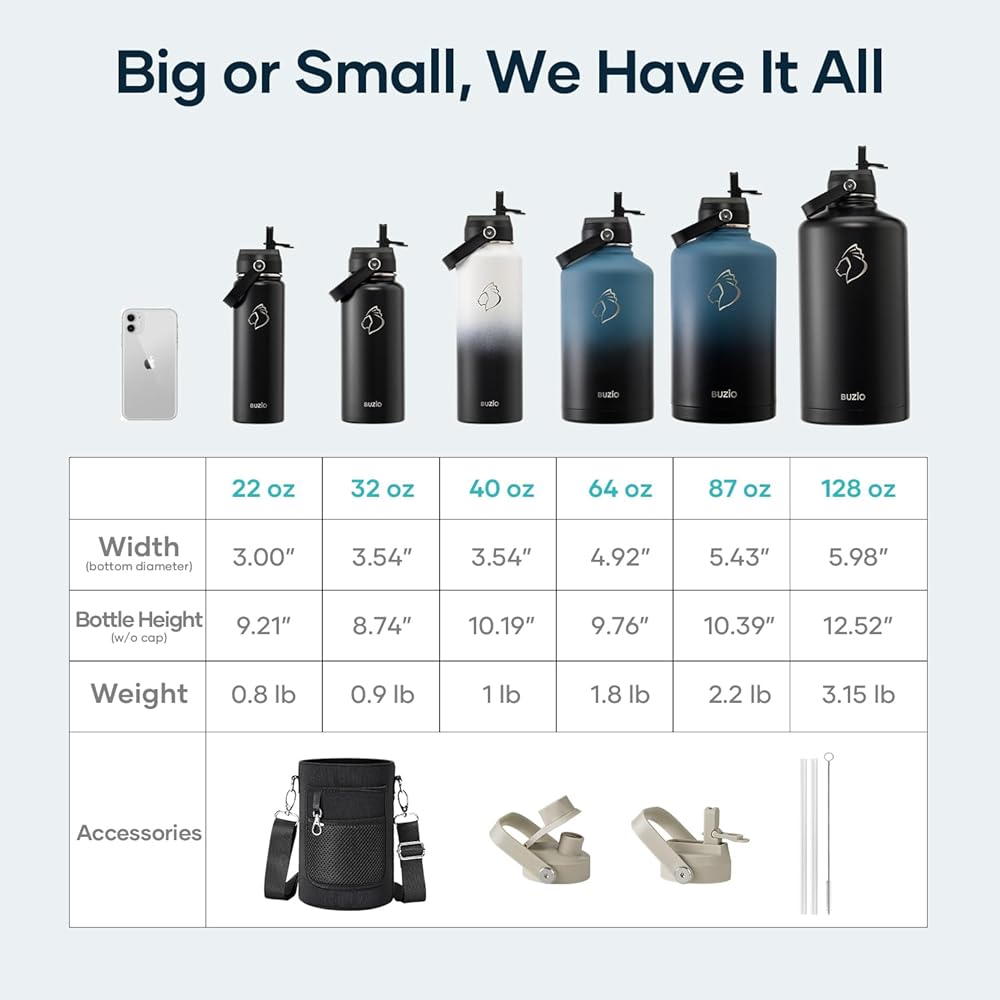 What You Get: Buzio 64oz Water Bottle with carrying pouch, Straw Lid, Flex Lid, 2 x Straws, Bottle Brush, our worry-free lifetime warranty and friendly customer service