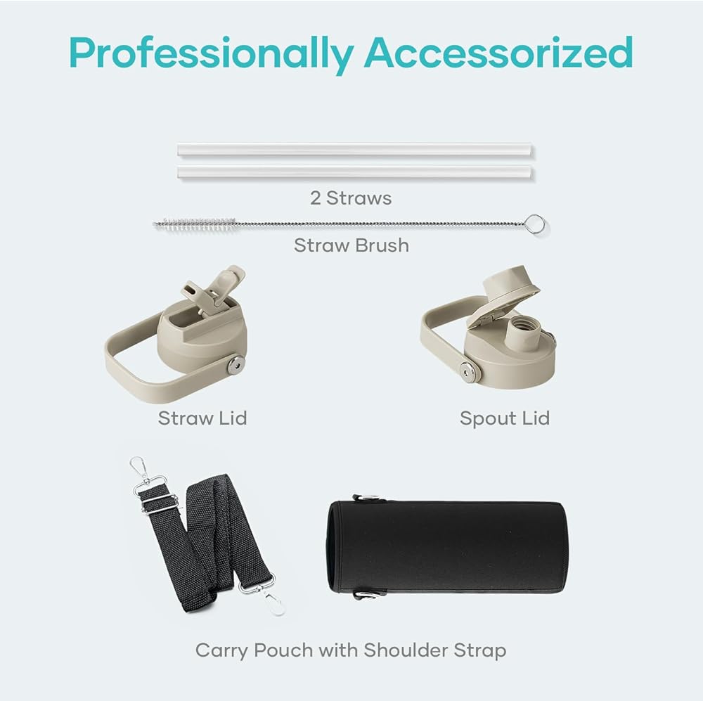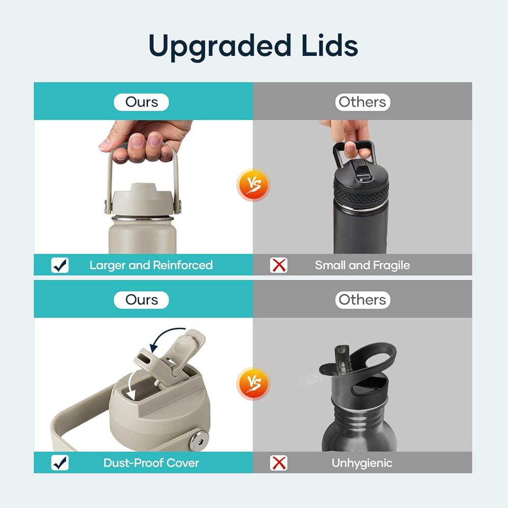 2 Caps Pack: This 64 oz stainless steel water bottle comes with straw lid and flex cap, the flex cap is perfect for the beach, camping and hiking, while the straw lid is suitable for cycling and road trip