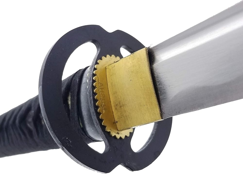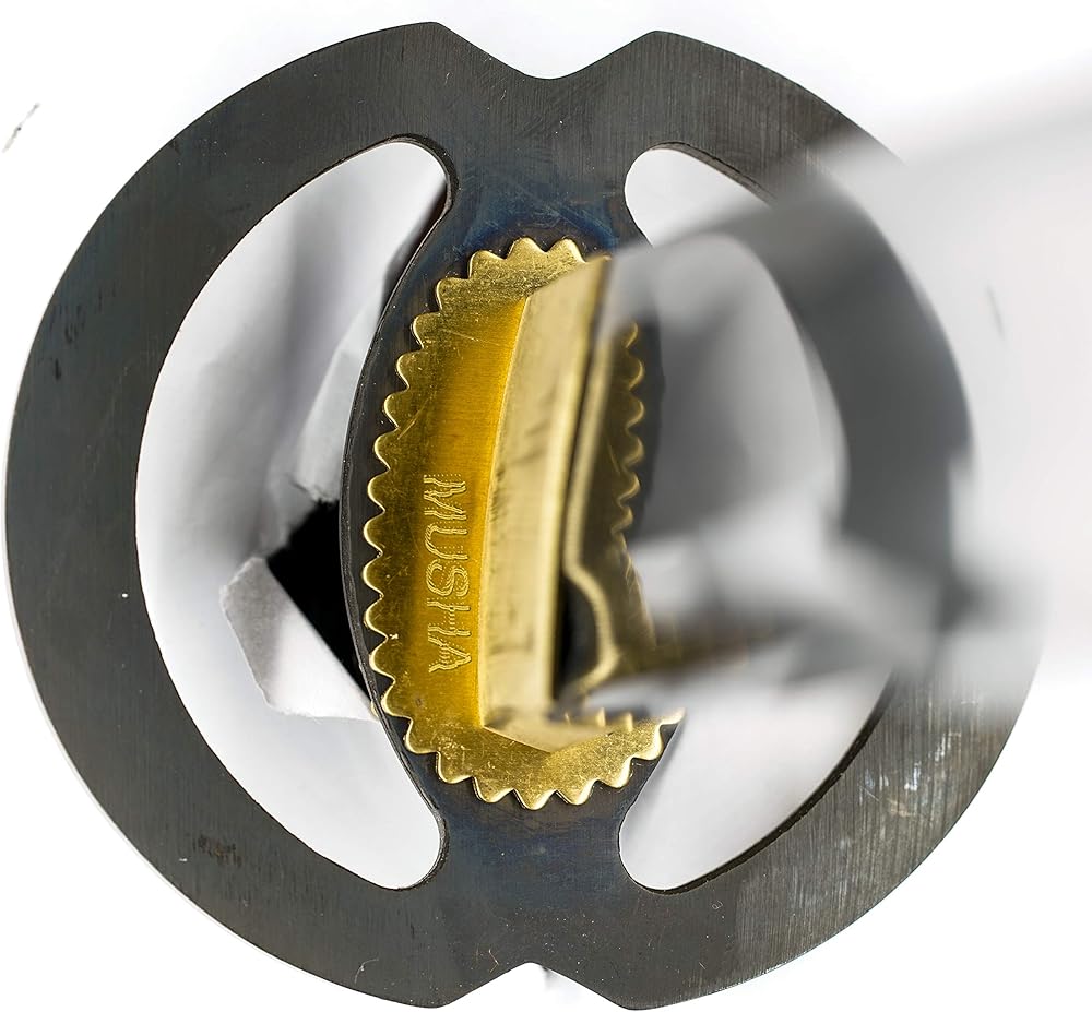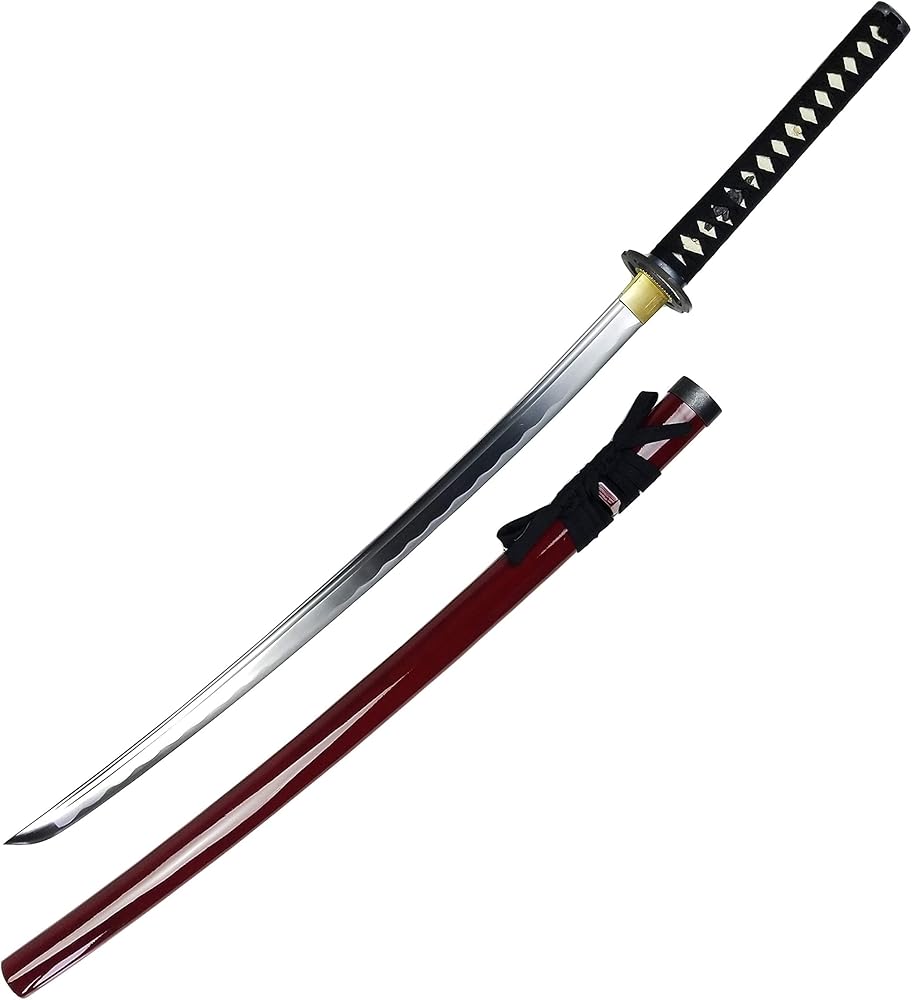 From the Musha Collection comes this intricately hand forged Musashi “Five Rings” Katana. Full tang 1045 high carbon steel makes this a resilient katana that is razor sharp right out of the box. Traditional burgundy color themed katana with Musashi Five Ring style tsuba. The Tsuba depicts the crest that is a representation the Book of Five Rings written by the famous Japanese swordsman Miyamoto Musashi. If you look at the tsuba closely, you will see that it is actually 5 rings coming together, overlapping each other to create the infinity loop. This blade features integrated Bo-Hi on the blade. Bo-Hi is commonly known as blood grooves, but that is a common misconception. The purpose of the Bo-Hi is to help reduce the weight of the katana, it actually has nothing to do with channeling the blood. Making the Katana lighter enables the user to wield the katana better and puts less stress on the hands. Not to mention it benefits some advance cutting techniques that requires the katana to change direction rapidly. All Musha swords are able to be fully disassembled. Musashi style Tsuba, Fuchi, and Kashira all can be swapped out for a different set. Real wood handle is wrapped with traditional cotton.
